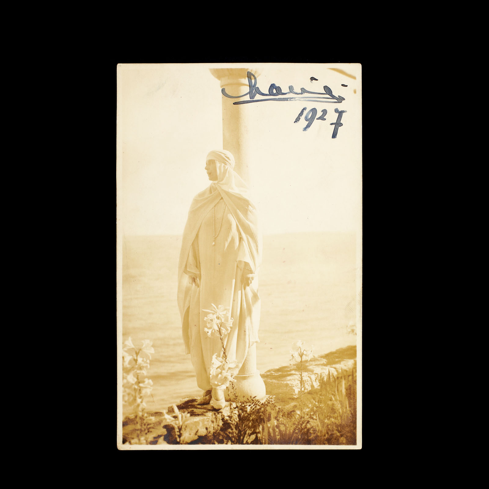 155. Carte poștală înfățișând-o pe Regina Maria la Balcic, 1927, cu semnătura olografă a reginei