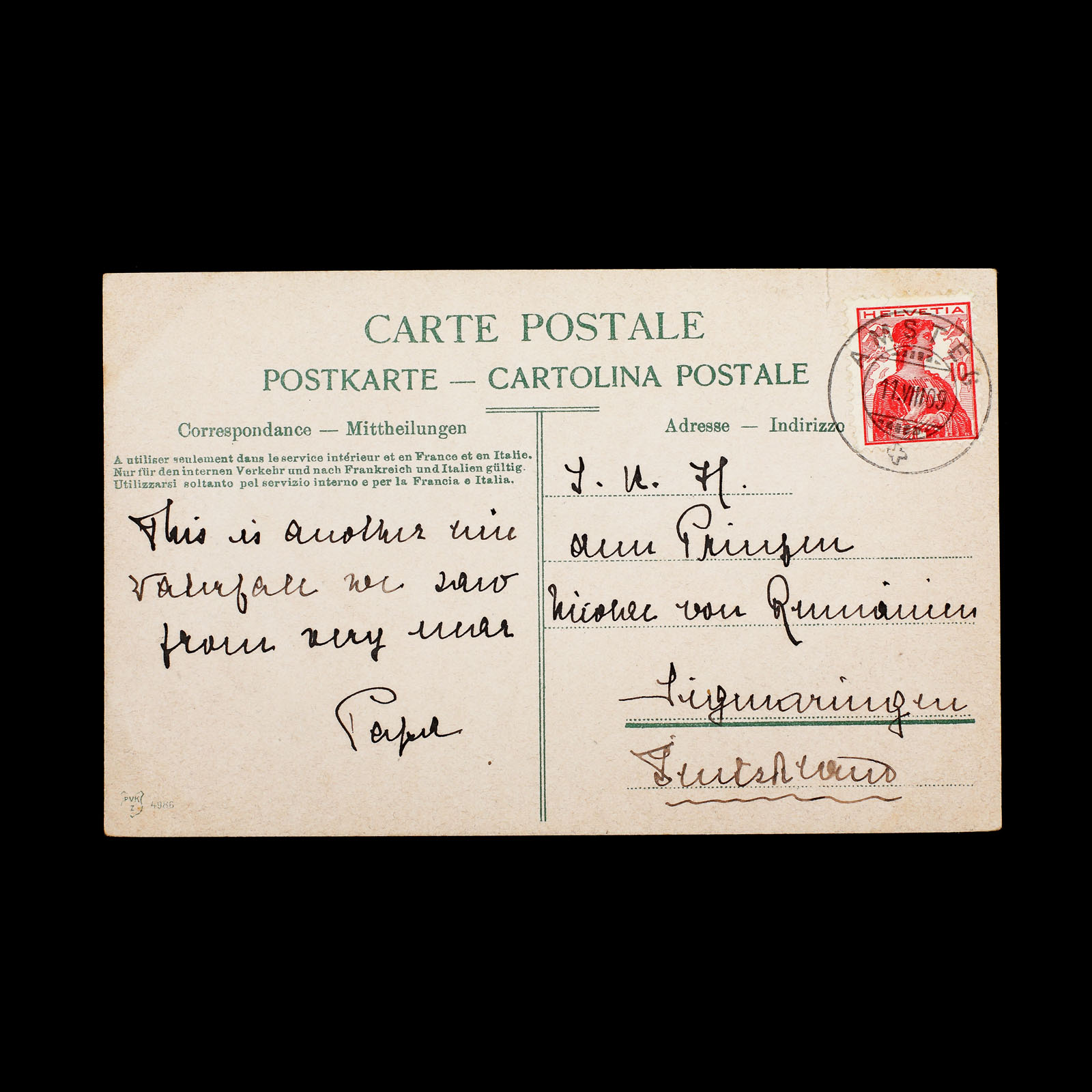161. Carte poștală trimisă de Regele Ferdinand către fiul său, principele Nicolae, 11 august 1909, cu semnătura olografă a acestuia