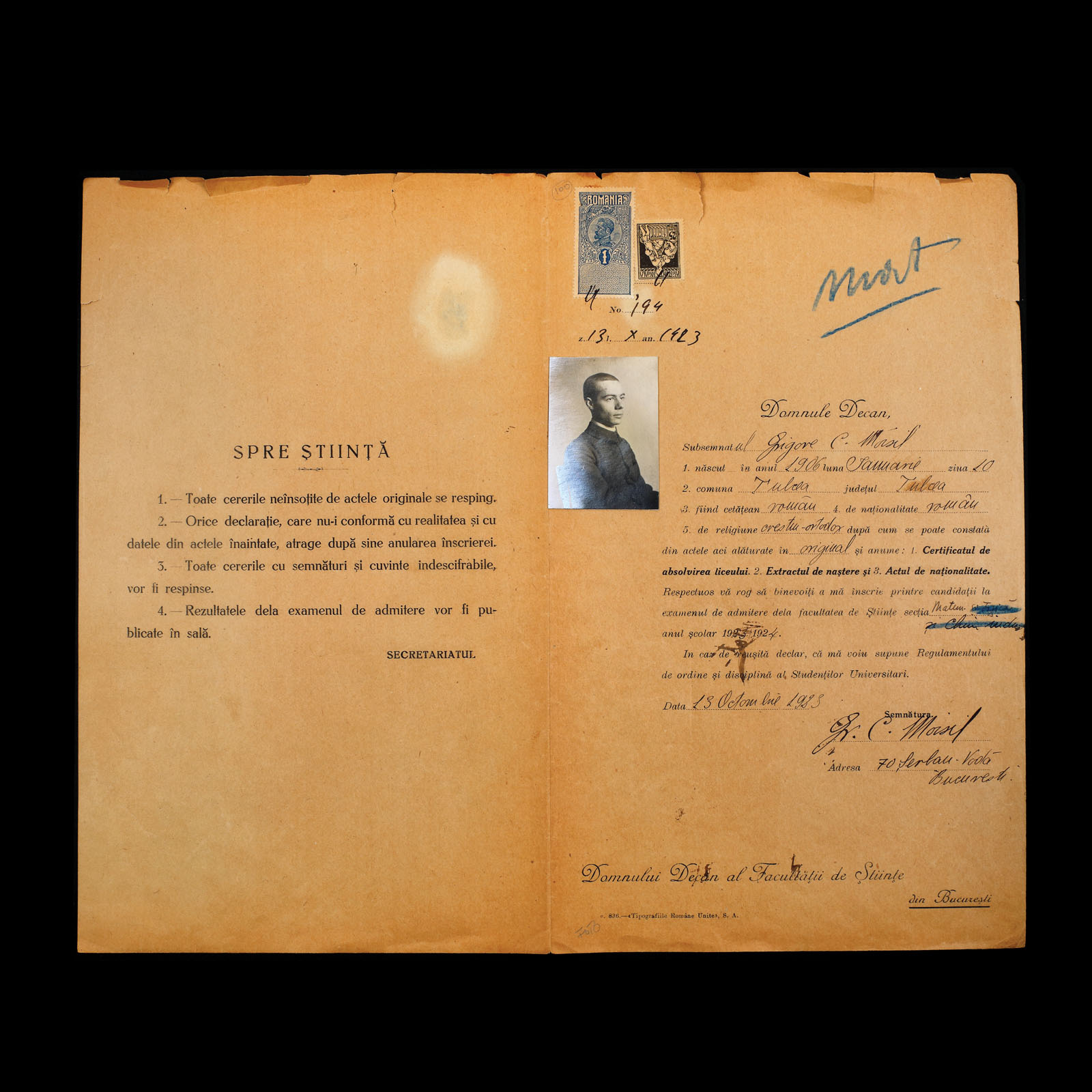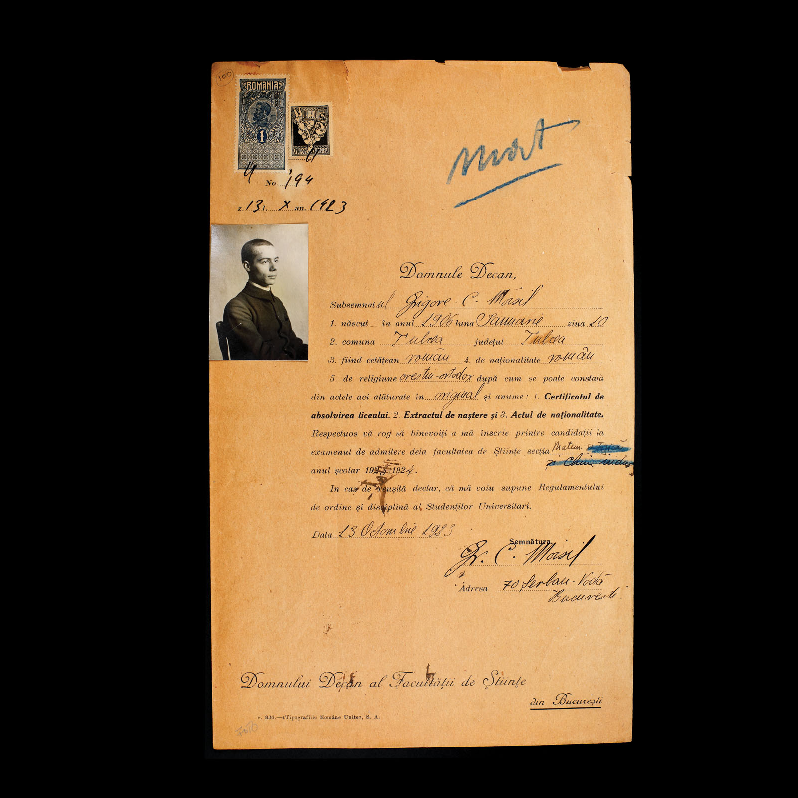227. Cerere de înscriere a lui Grigore Moisil la Facultatea de Matematică și Fizică, 13 octombrie 1923, cu semnătura olografă a matematicianului
