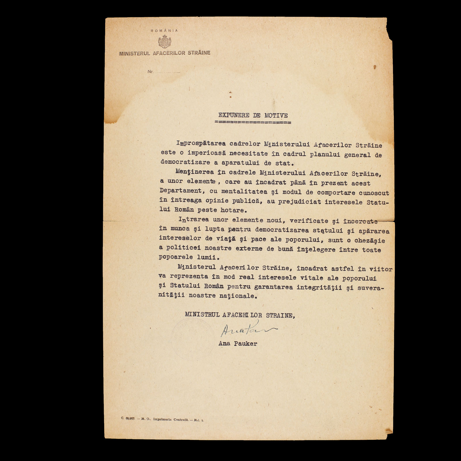 175A. Document de propagandă emis de Ana Pauker, Ministru Secretar de Stat al Departamentul Afacerilor Străine, cu semnătura olografă a acesteia