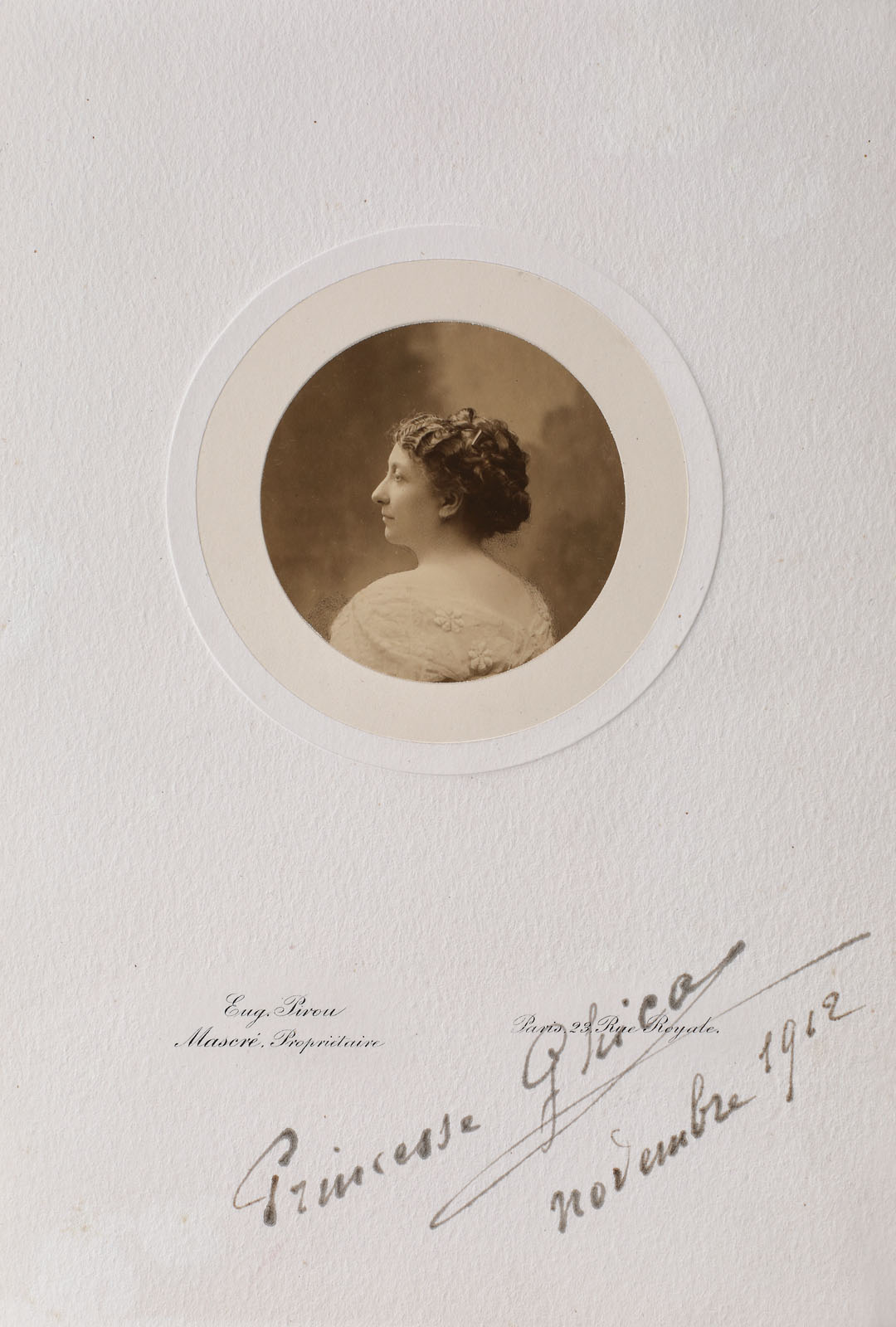 159. Fotografie ilustrând-o pe Alexandrina Ghica, soția diplomatului Ion Ghica, atelier Eugène Pirou, Paris, noiembrie 1912, cu semnătura olografă a prințesei