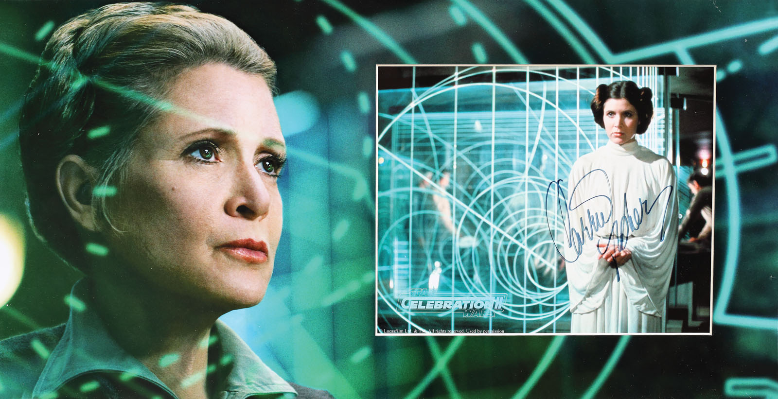 150A. Fotografie ilustrând-o pe Prințesa Leia, cu semnătura olografă a actriței Carrie Fisher și certificat de autenticitate
