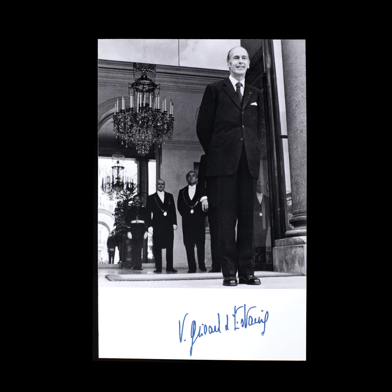202. Fotografie ilustrându-l pe fostul Președinte al Franței, Giscard D'Estaing, cu semnătura olografă a politicianului și certificat de autenticitate