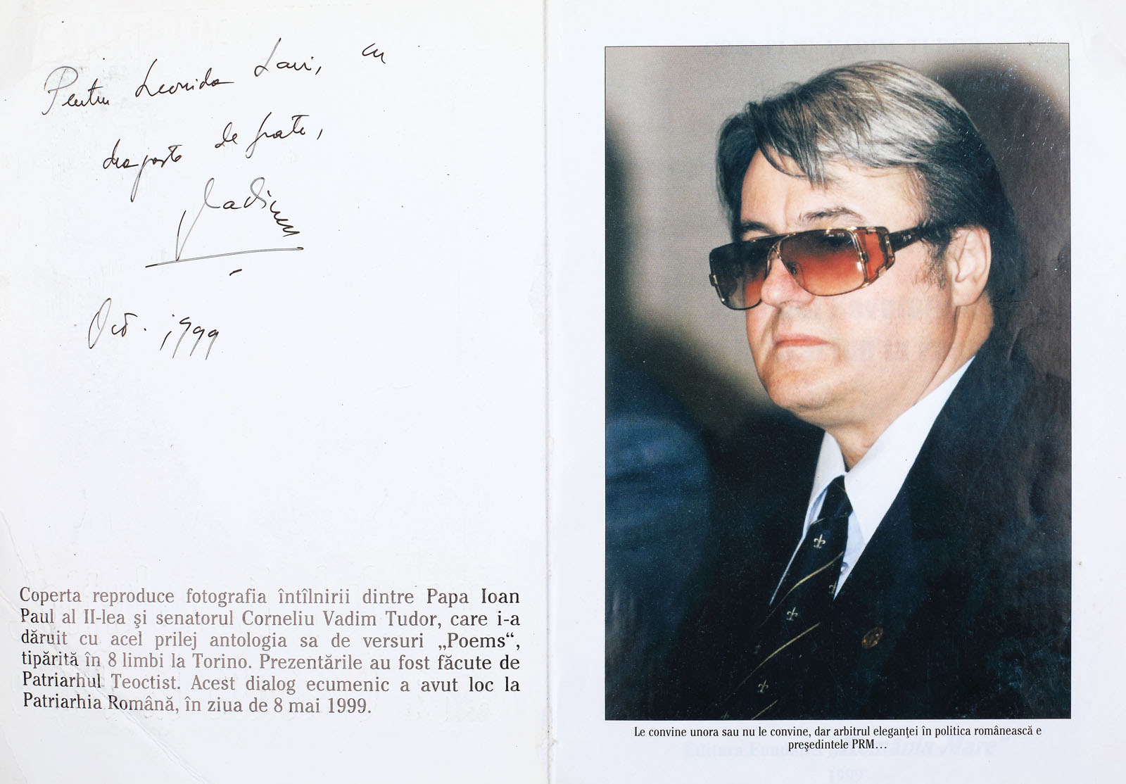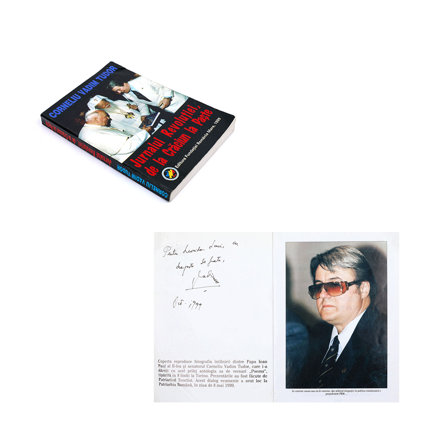 221. "Jurnalul Revoluției, de la Crăciun la Paște", de Corneliu Vadim Tudor, București, 1999, cu dedicația și semnătura olografă a autorului către poeta Leonida Lari