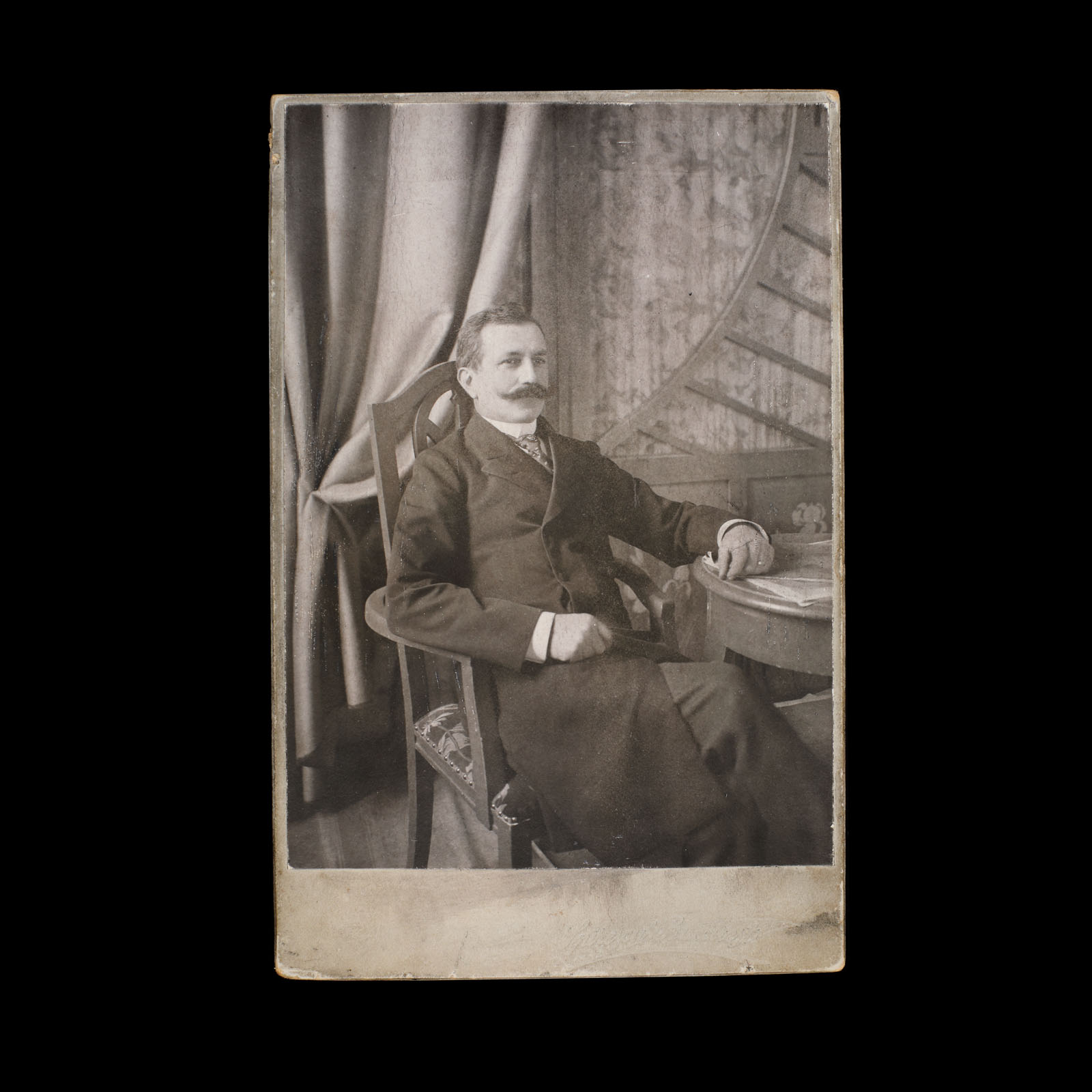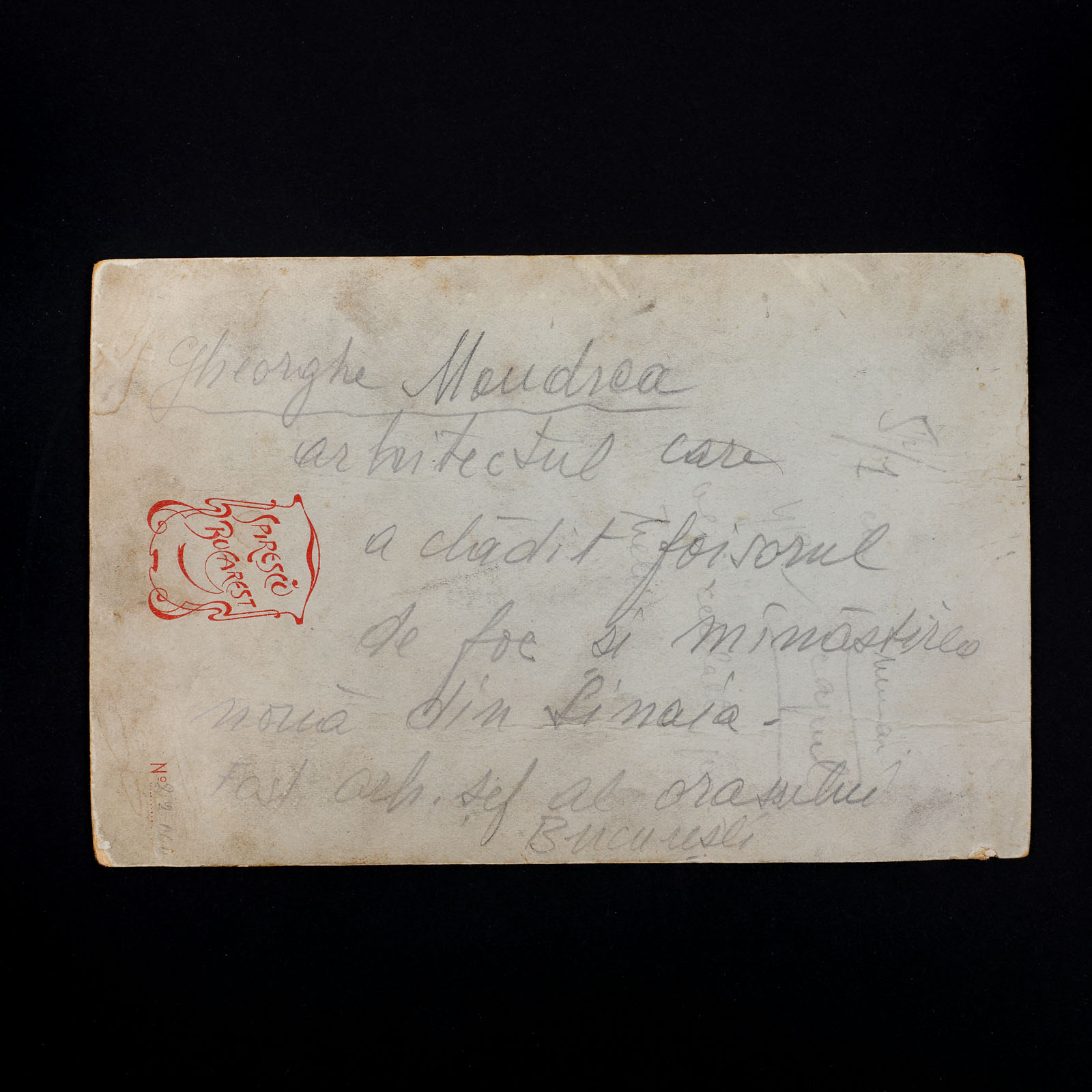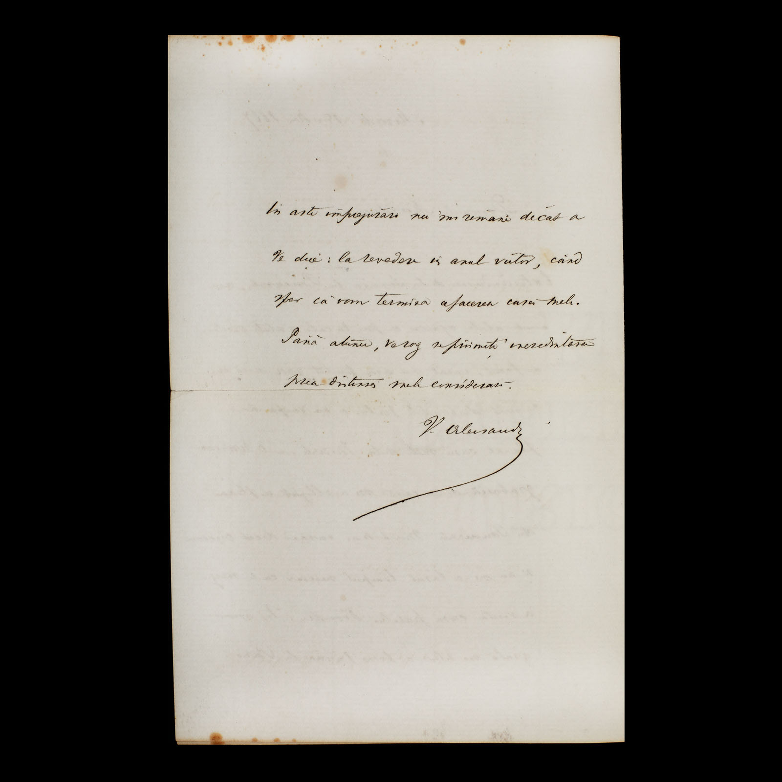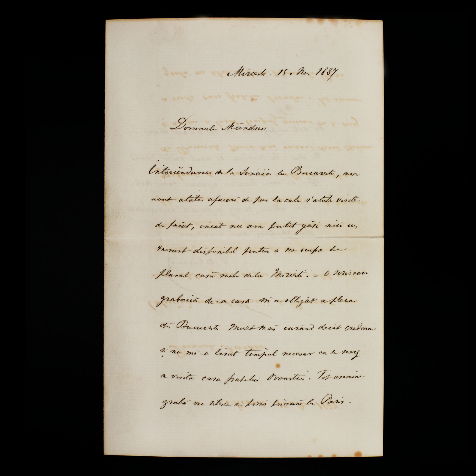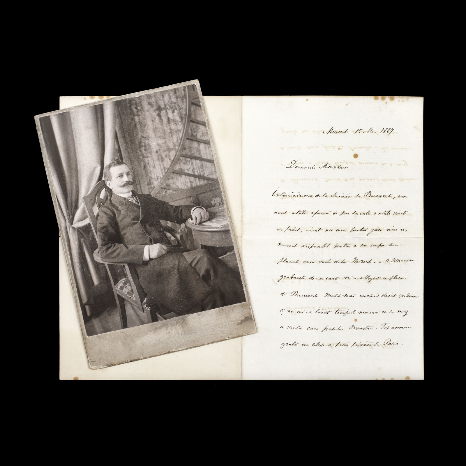 189. Lot format dintr-o scrisoare, trimisă de Vasile Alecsandri către arhitectul șef al primăriei capitalei, Gheorghe Mândrea, Mircești, 15 noiembrie 1887 (2 file) și o fotografie ilustrându-l pe Gheorghe Mândrea, atelier Spirescu, cca. 1890