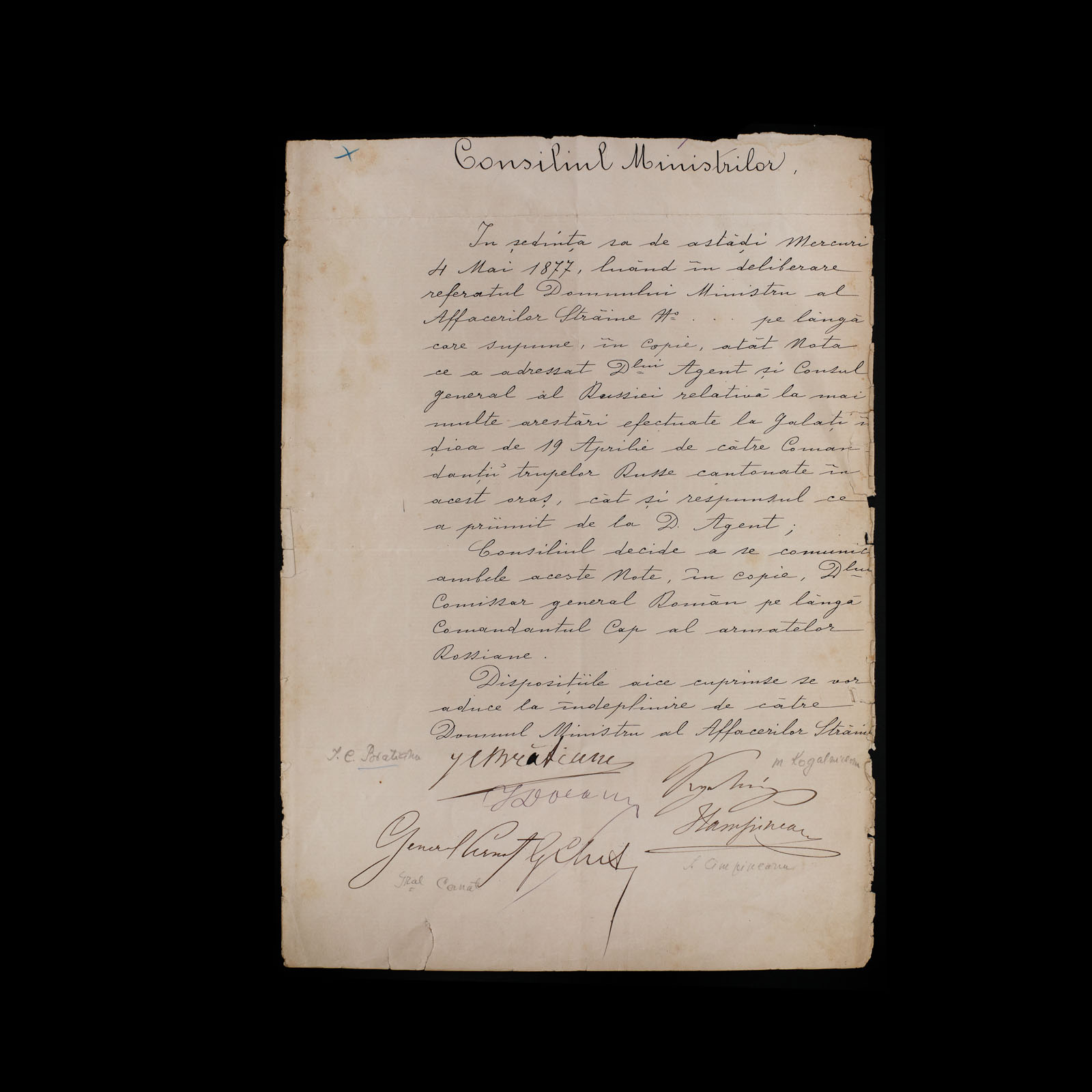 167A. Minută din data de 4 mai 1877 referitoare la problema unor arestări efectuate de comandanții trupelor ruse, cu semnăturile olografe ale lui Ion C. Brătianu, Mihail Kogălniceanu, Ion Câmpineanu și a generalului Alexandru Cernat
