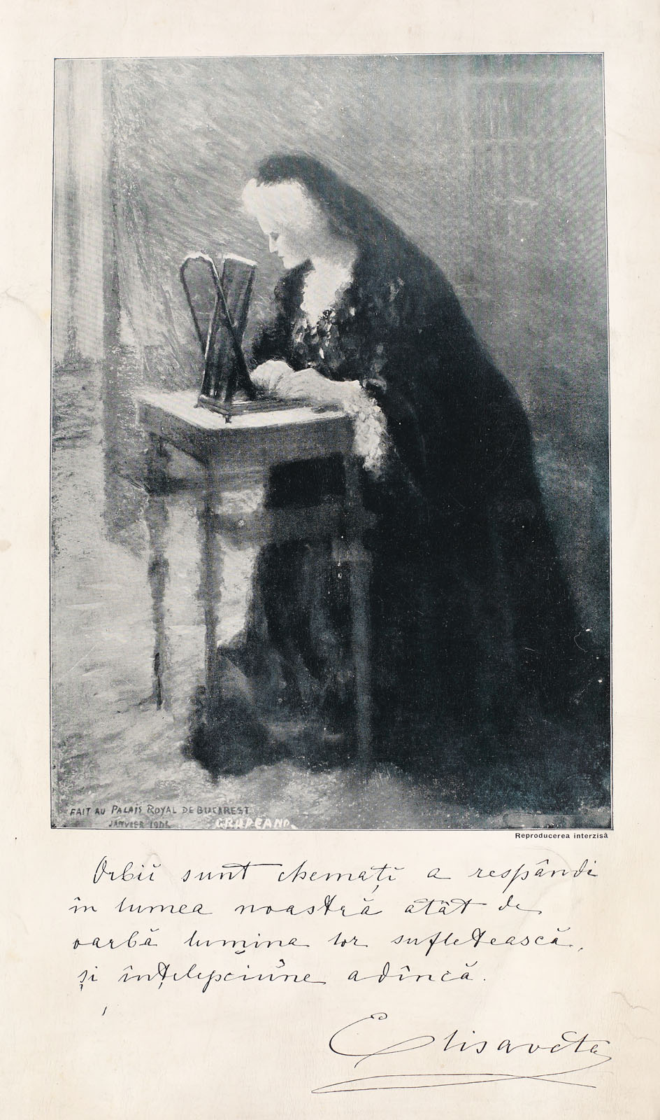 164. Panseu manuscris de Regina Elisabeta, pe o reproducere a portretului Reginei realizat de pictorul Nicolae Gropeanu (1908), prezentând-o pe Regină la o mașină de scris Braille, cu semnătura olografă a acesteia