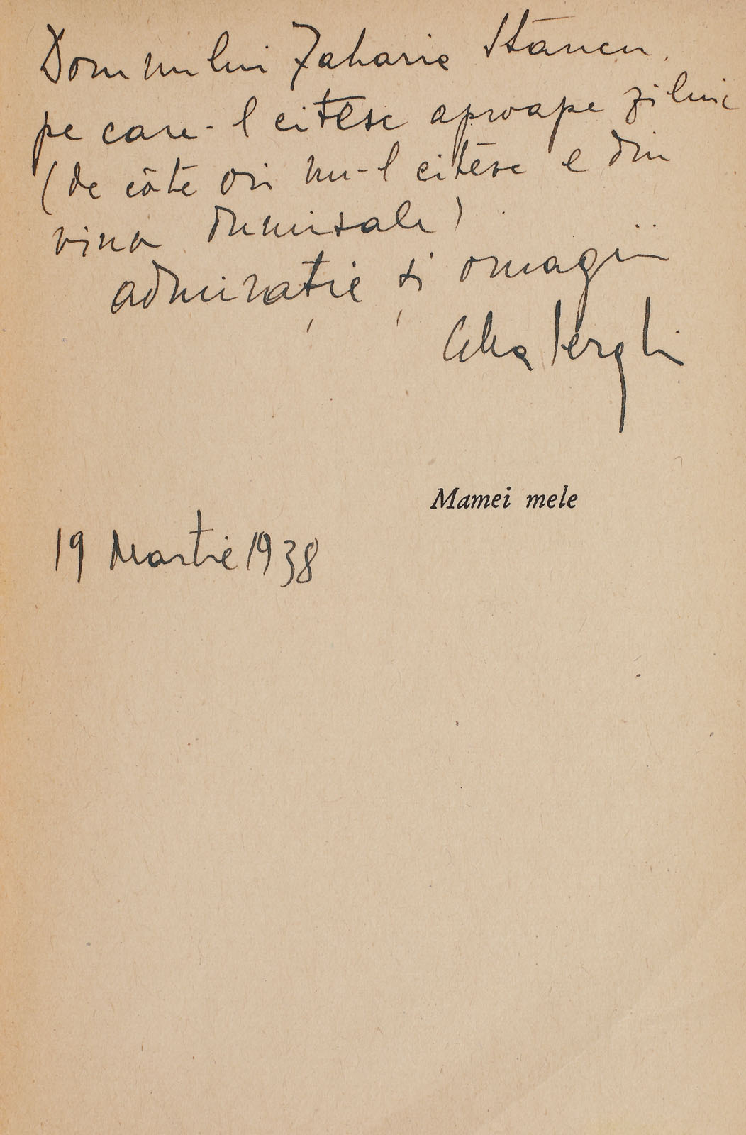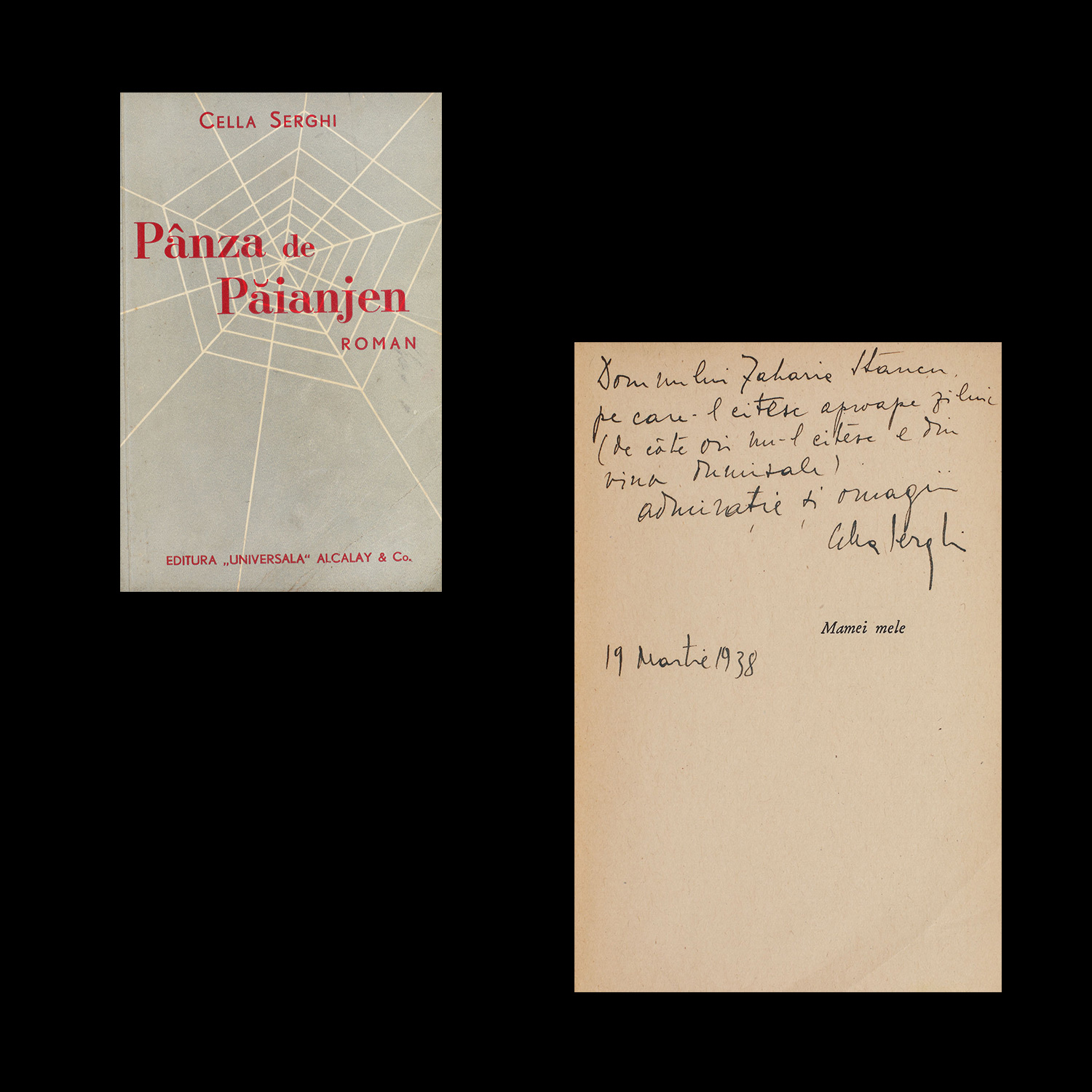 229. ”Pînza de păianjen”, de Cella Serghi, București, 1938, cu dedicația autoarei către Zaharia Stancu, provine din colecția scriitorului Zaharia Stancu