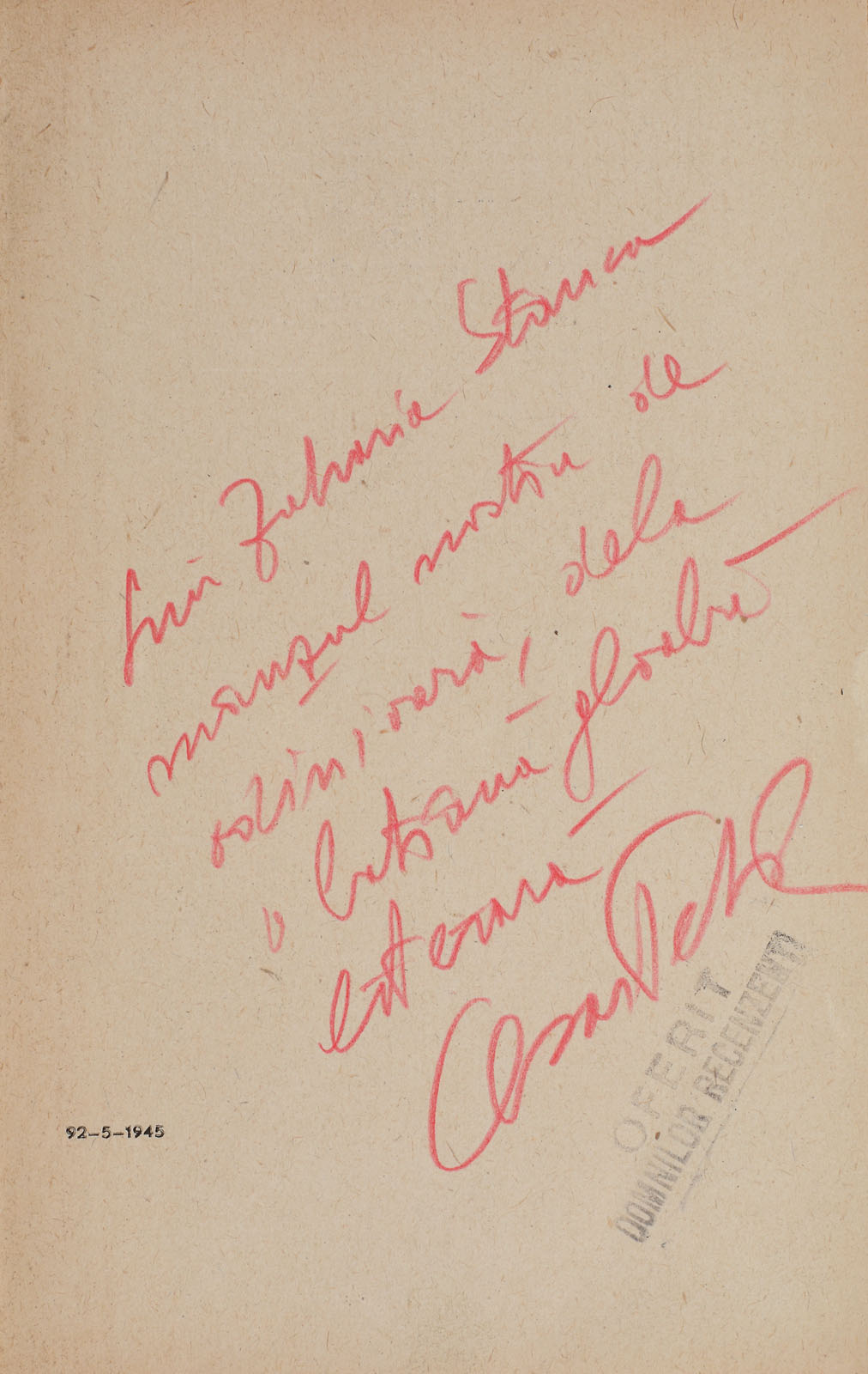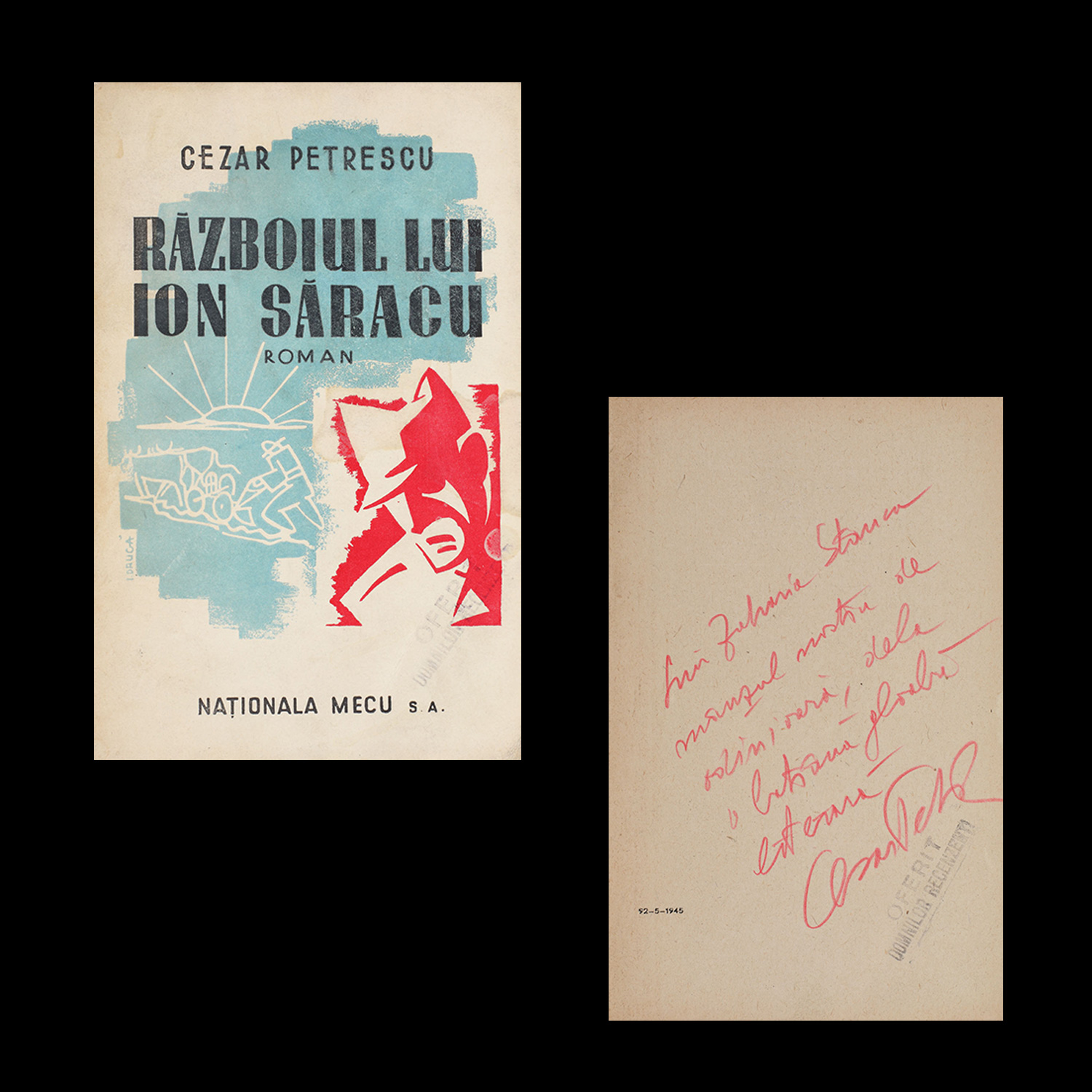 234. ”Războiul lui Ion Săracu”, de Cezar Petrescu, București, 1945, cu dedicația autorului către Zaharia Stancu, provine din colecția scriitorului Zaharia Stancu