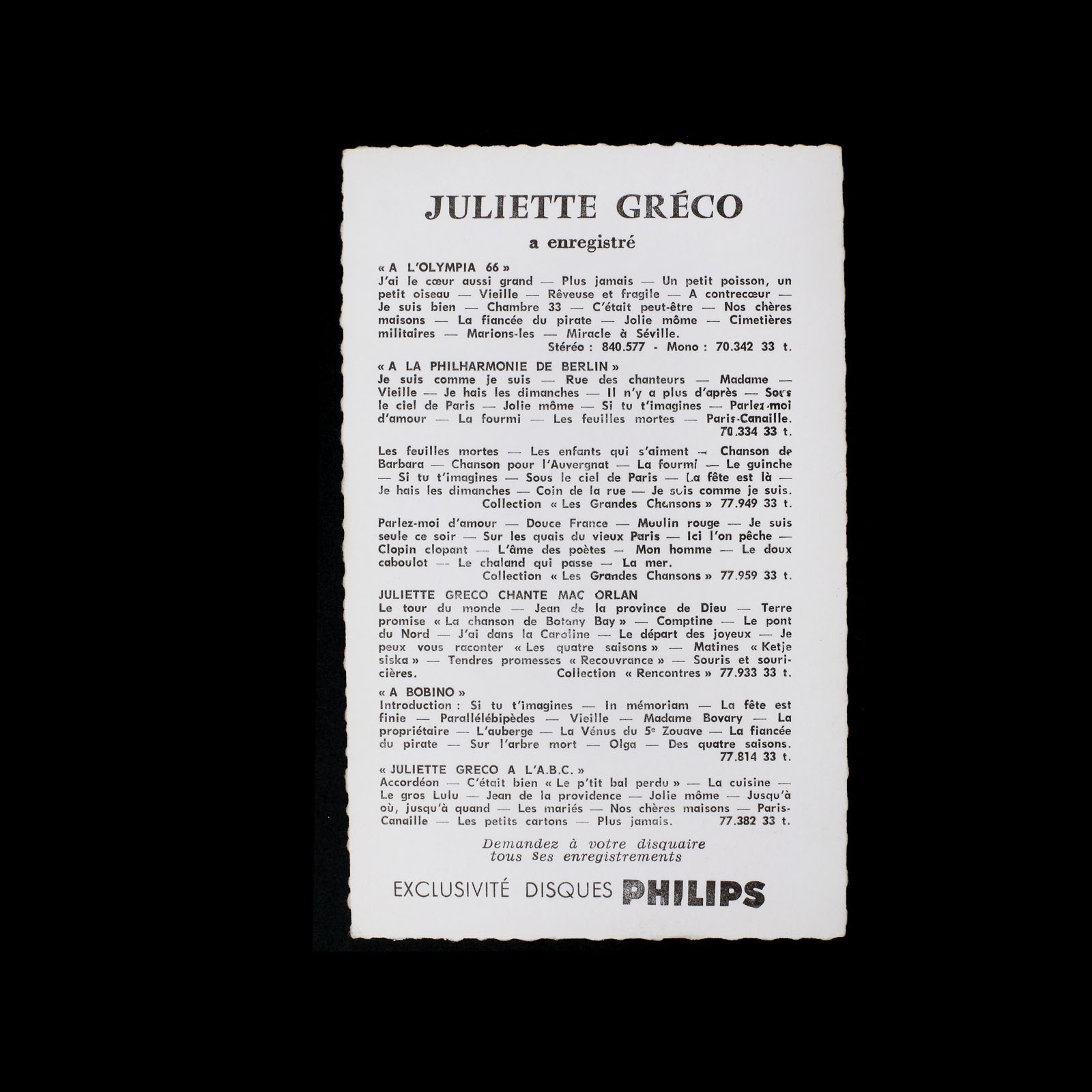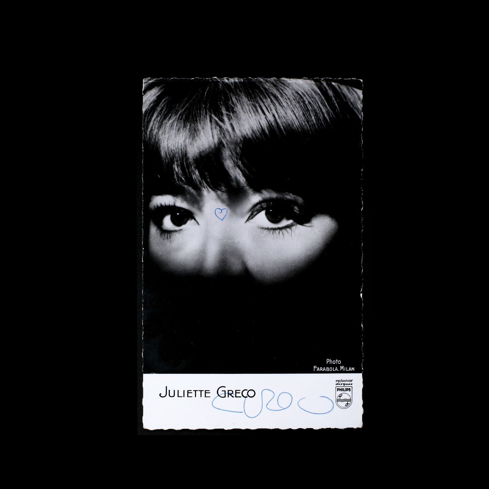 201. Reclamă ilustrând-o pe actrița Juliette Greco, cca. 1969, cu semnătura olografă a acesteia