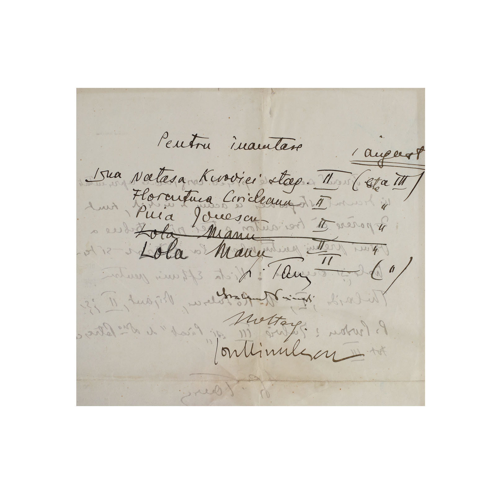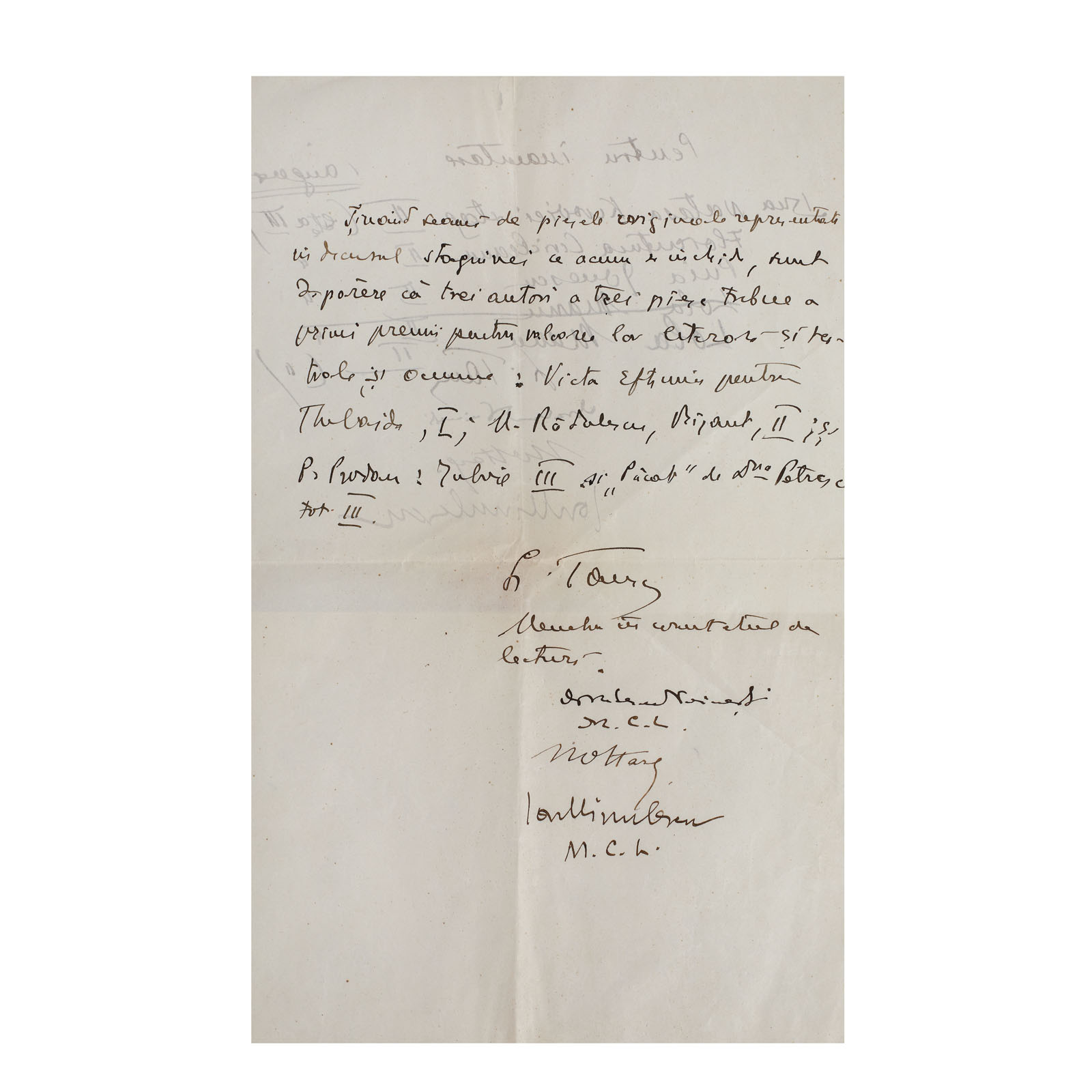 216. Scrisoare conținând propunerea de premiere a scriitorilor Victor Eftimiu, Mihai Rădulescu, cu semnăturile olografe ale lui Ion Minulescu, Ioan Alexandru Brătescu-Voinești și Constantin I. Nottara