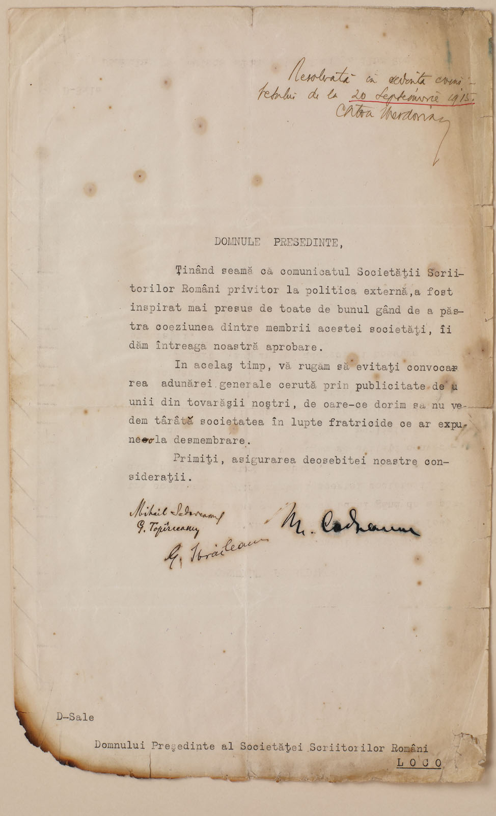 217. Scrisoare trimisă către Corneliu Moldovan, președintele ”Societății Scriitorilor Români”, 20 septembrie 1915, cu semnăturile olografe ale lui Mihail Sadoveanu, George Topîrceanu, Garabet Ibrăileanu și Nicolae Condiescu
