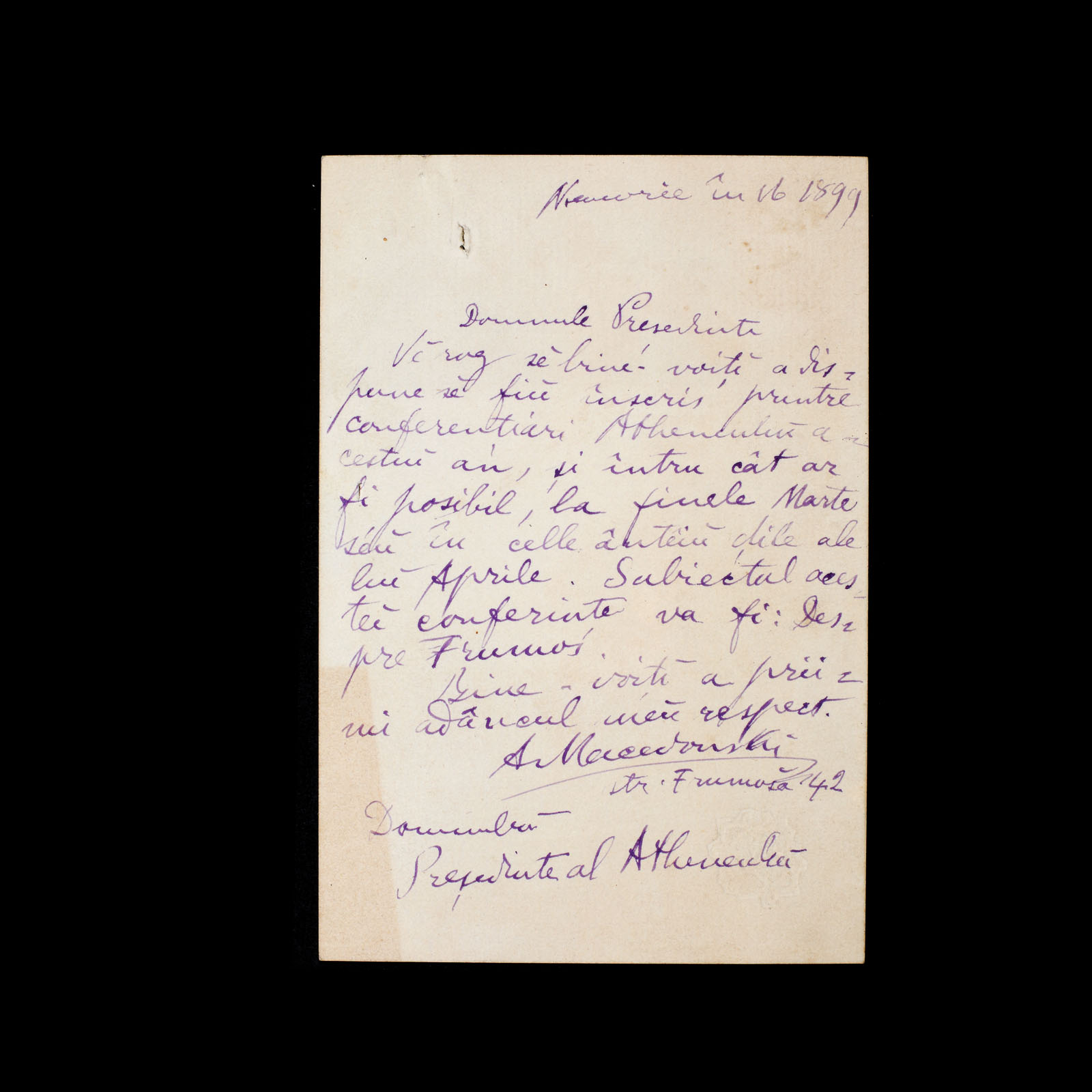 186. Scrisoare trimisă de Alexandru Macedonski către Nicolae Krețulescu, președintele Ateneului, în care solicită aprobarea de a susține o conferință intitulată ”Despre Frumos”, 16 noiembrie 1899