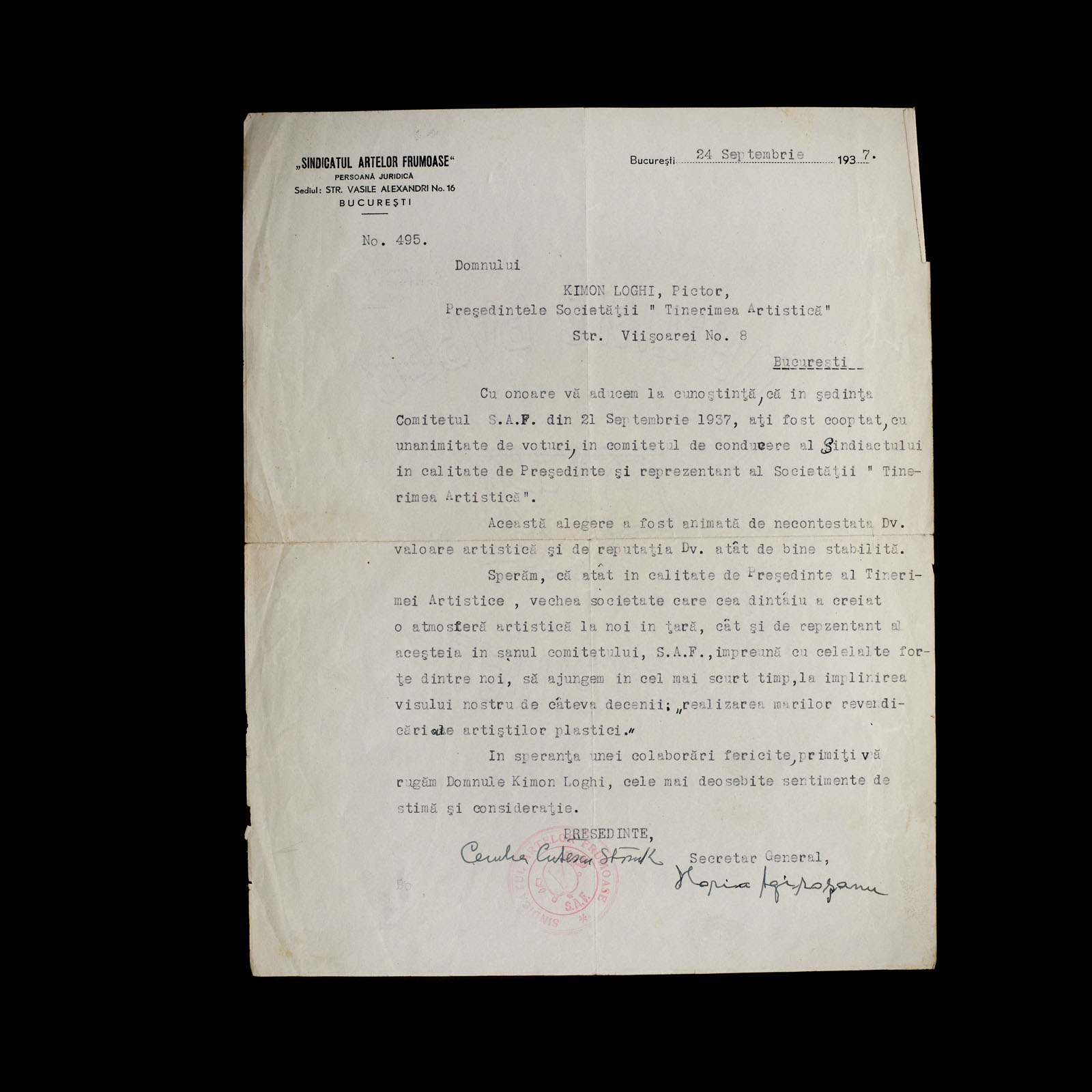 191. Scrisoare trimisă de preşedintele ”Sindicatului Artelor Frumoase”, Cecilia Cuțescu-Storck către pictorul Kimon Loghi referitoare la numirea acestuia în funcția de președinte și reprezentant al societății ”Tinerimea Artistică”, București, 24 septembrie 1937, cu semnătura olografă a Ceciliei Cuțescu-Storck