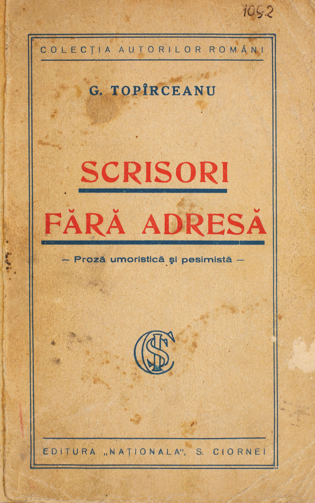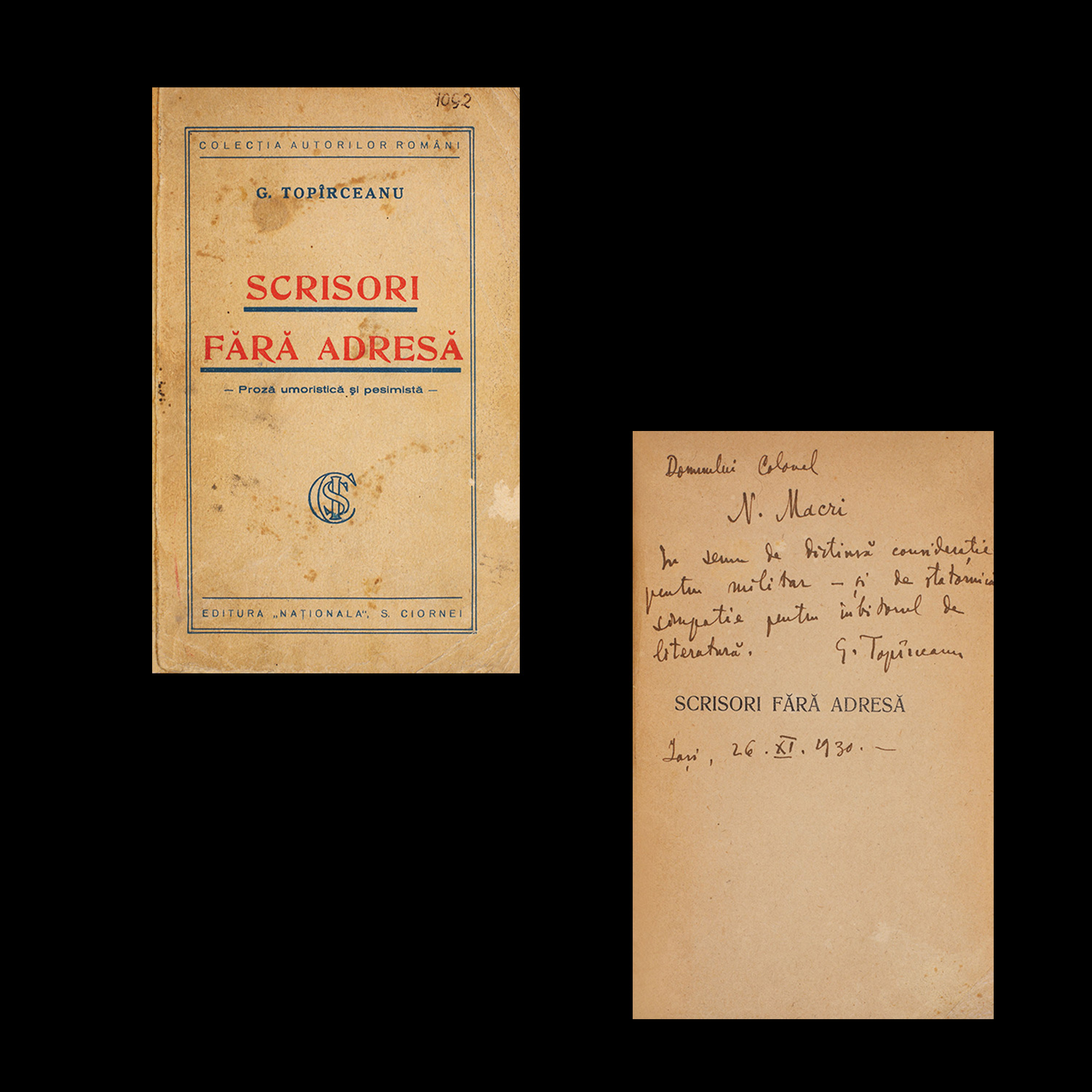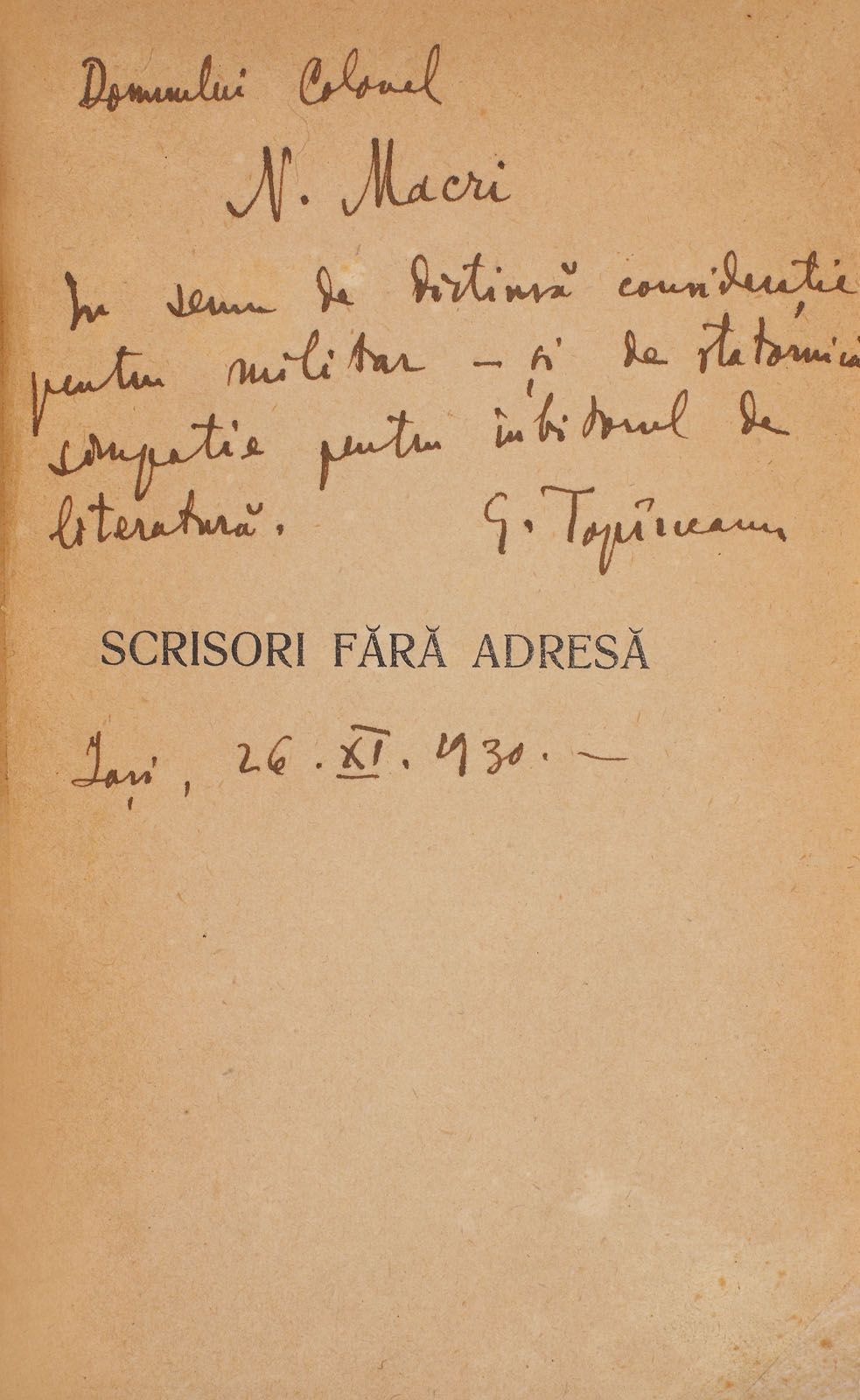 233. ”Scrisori fără adresă”, de George Topîrceanu, București, 1930, cu dedicația autorului către colonelul N. Macri