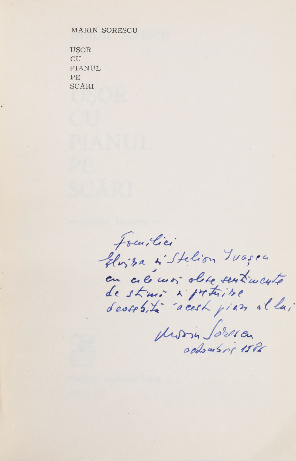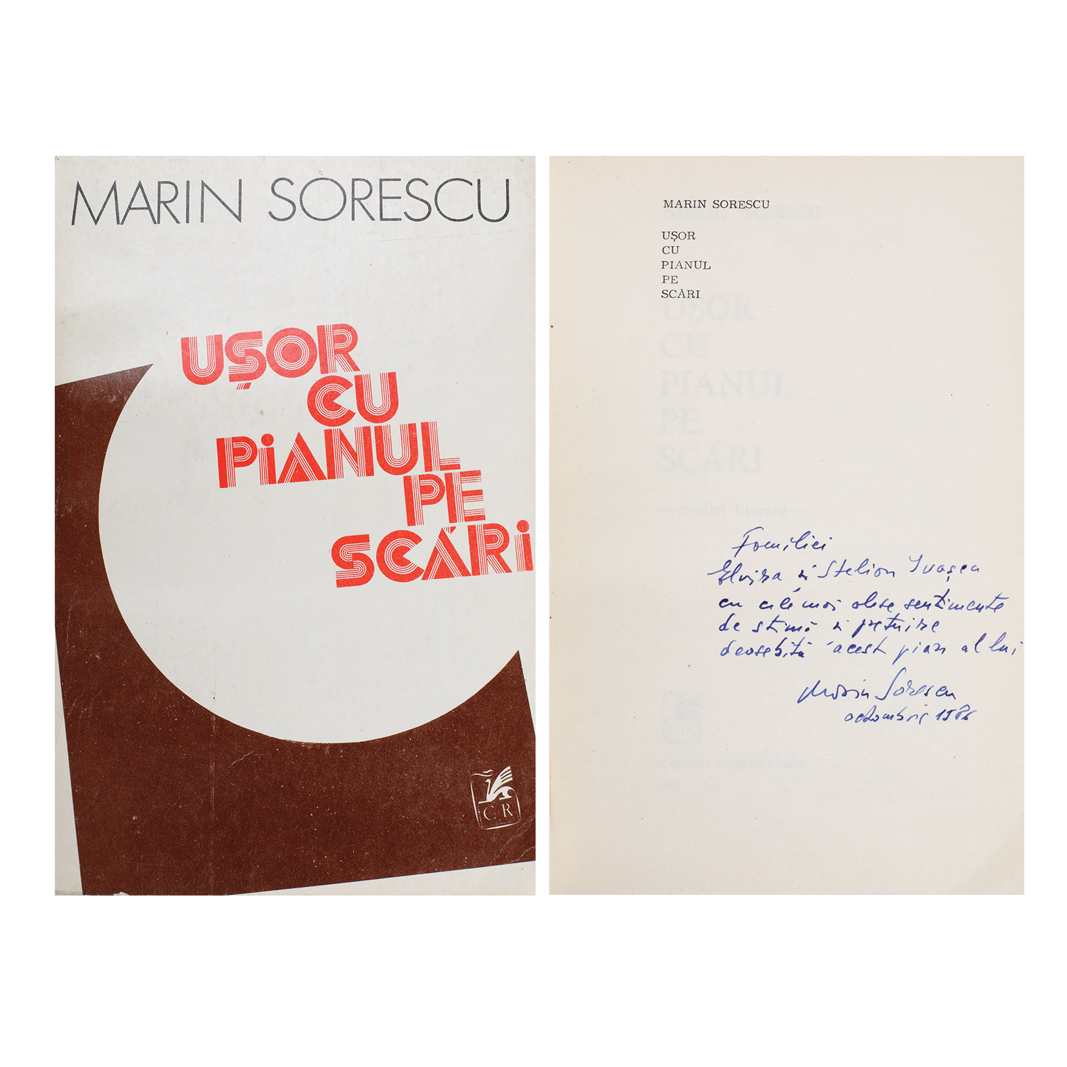 211. "Uşor cu pianul pe scări", de Marin Sorescu, Bucureşti, 1985, purtând dedicaţia şi semnătura olografă a autorului
