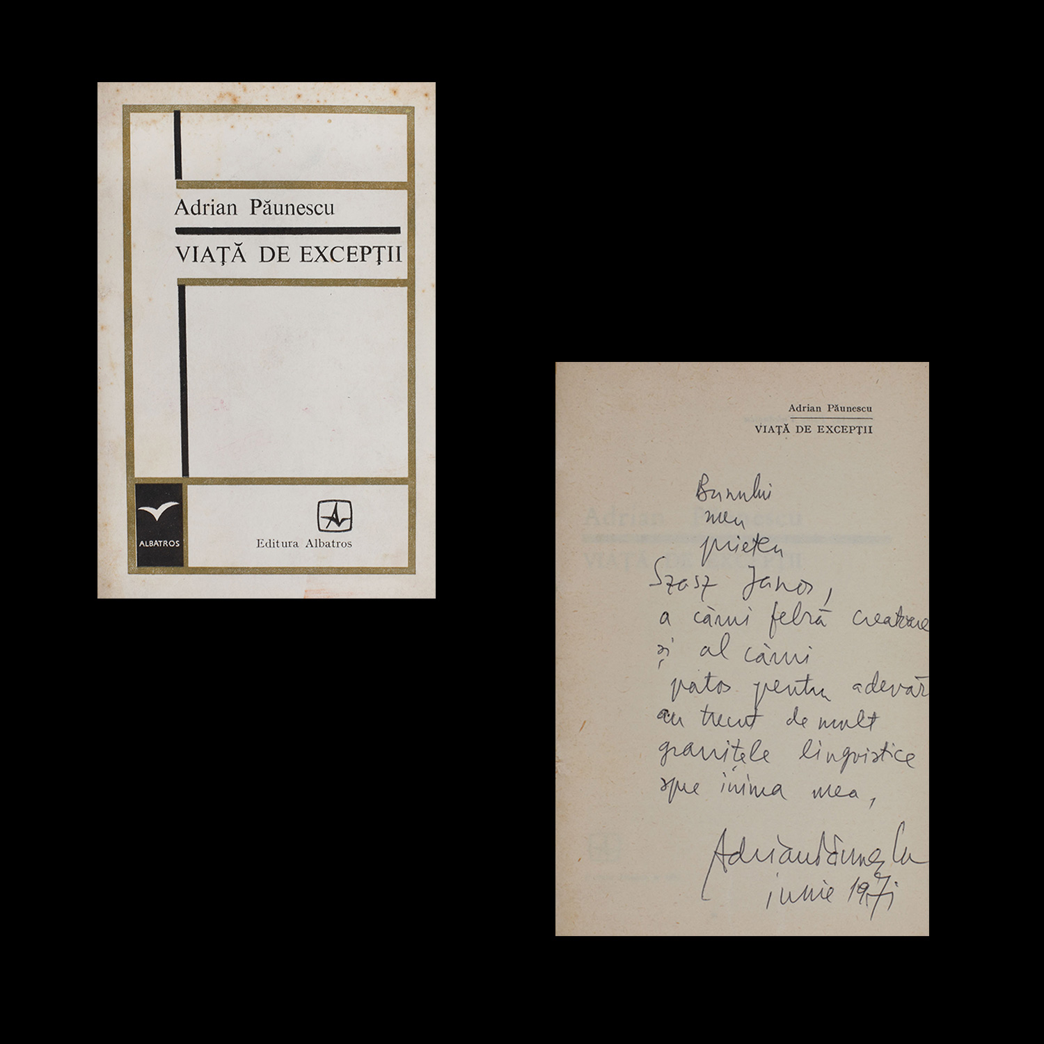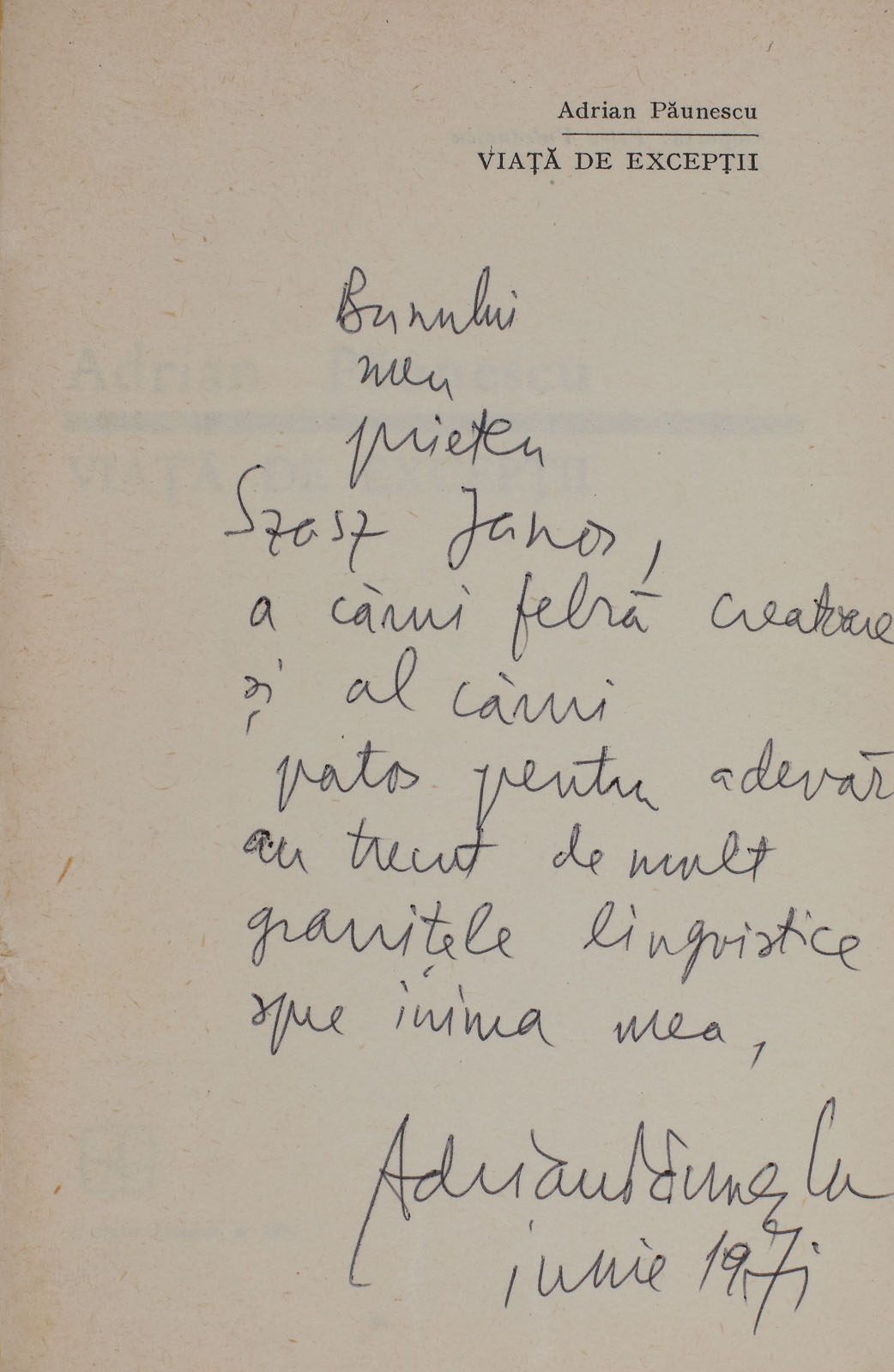 231. ”Viață de excepții”, de Adrian Păunescu, București, 1971, cu dedicația autorului către Szász János