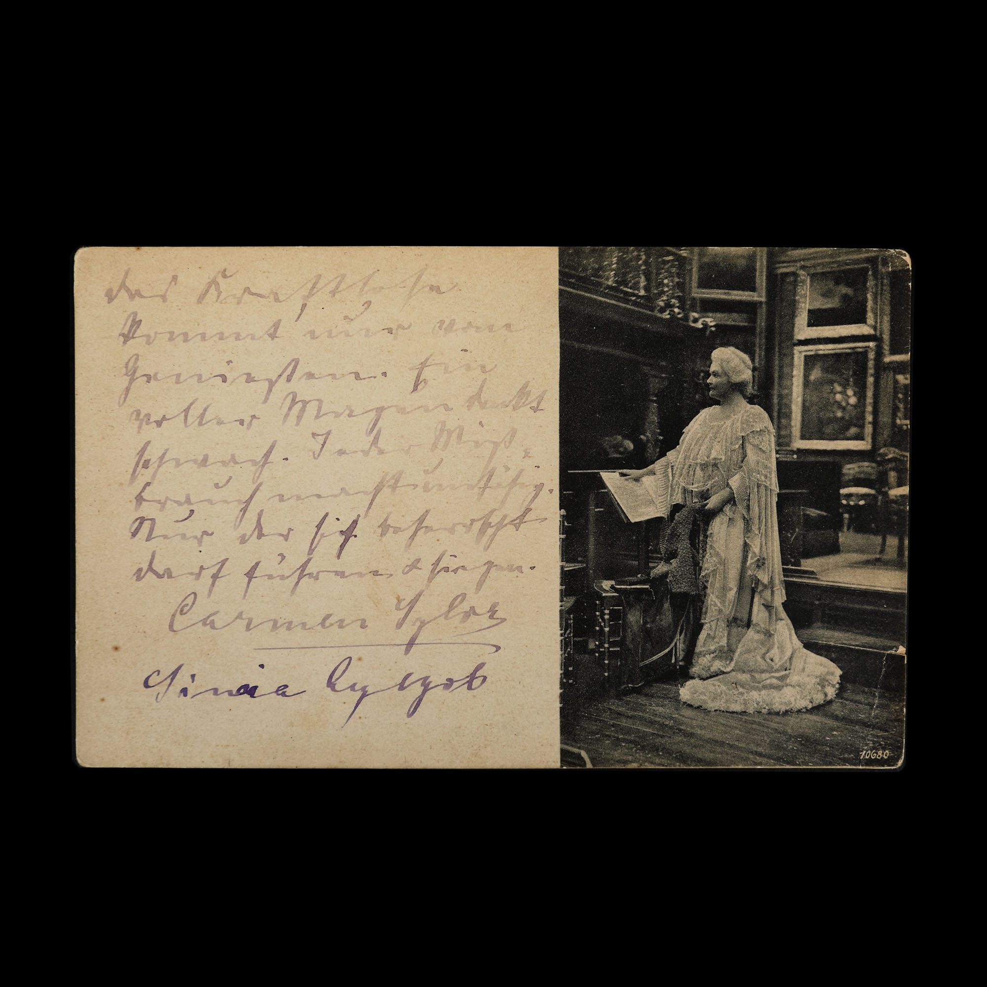 64. Carte poștală ilustrând-o pe Regina Elisabeta la Palatul Regal vechi în Sala de Muzică, cca. 1905, cu dedicația și semnătura olografă ale reginei