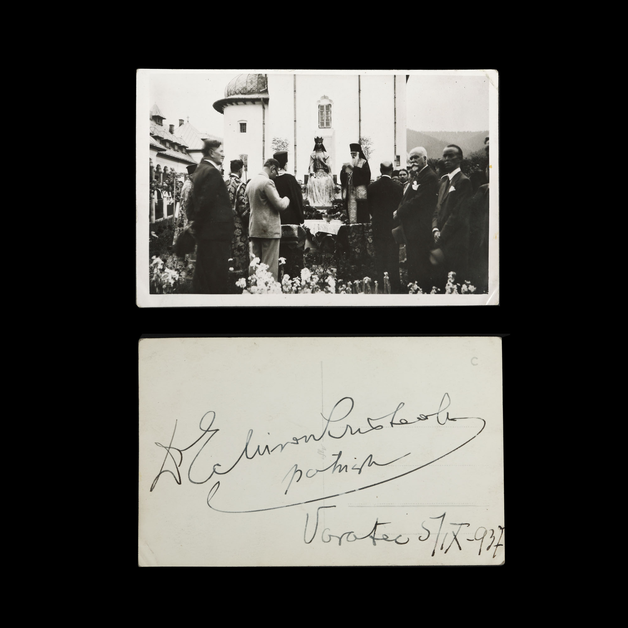59. Carte poștală ilustrându-l pe Patriarhul Miron Cristea oficiind o slujbă la Mănăstirea Văratec, 5 septembrie 1937, cu semnătura olografă