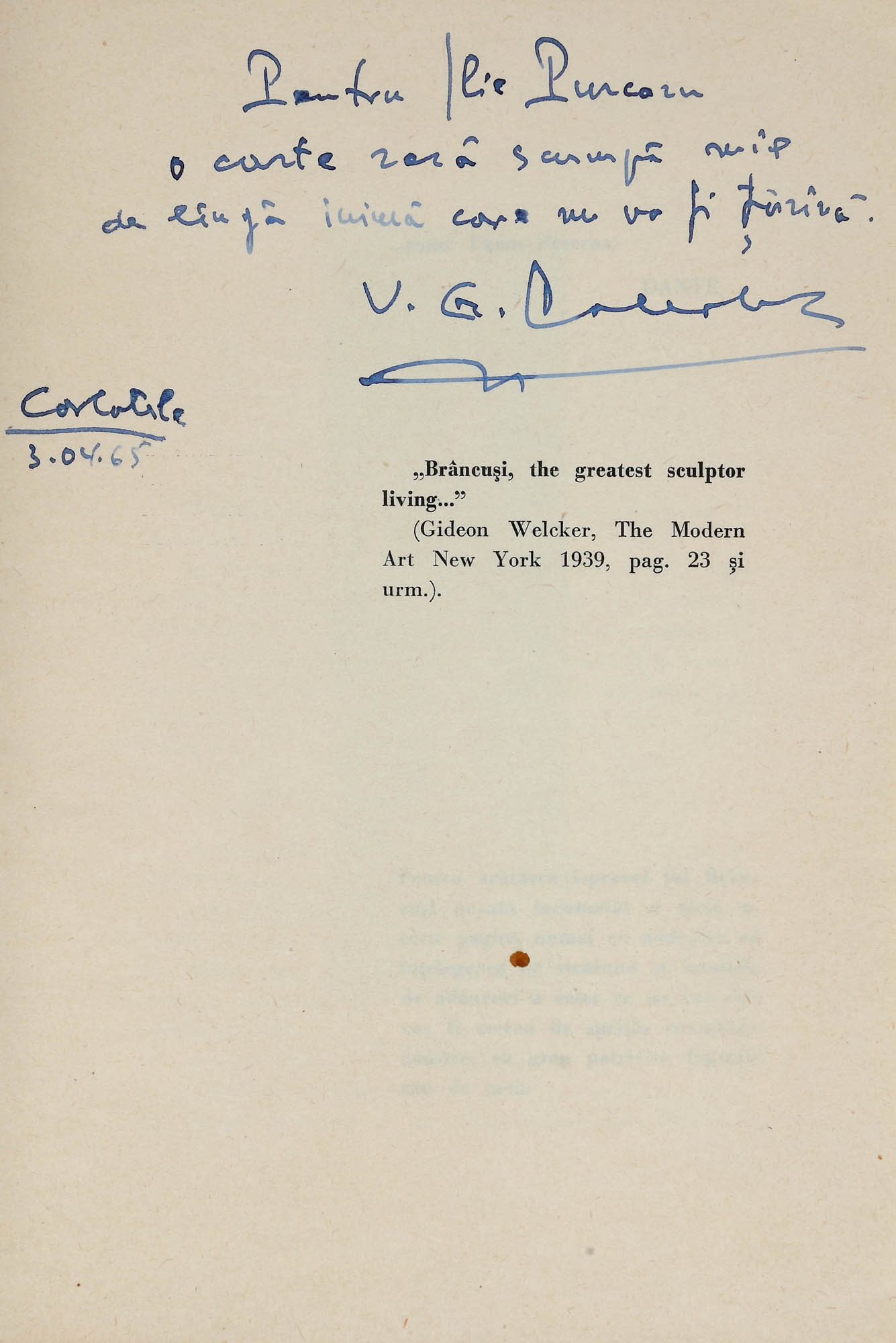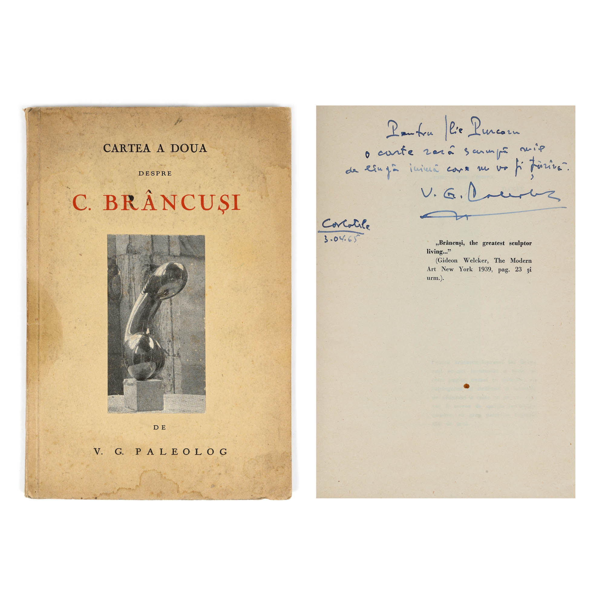 49. ”Cartea a doua despre Constantin Brâncuși”, de Vasile Georgescu Paleolog, Craiova, 1944, cu dedicația și semnătura olografă a autorului către publicistul Ilie Purcaru