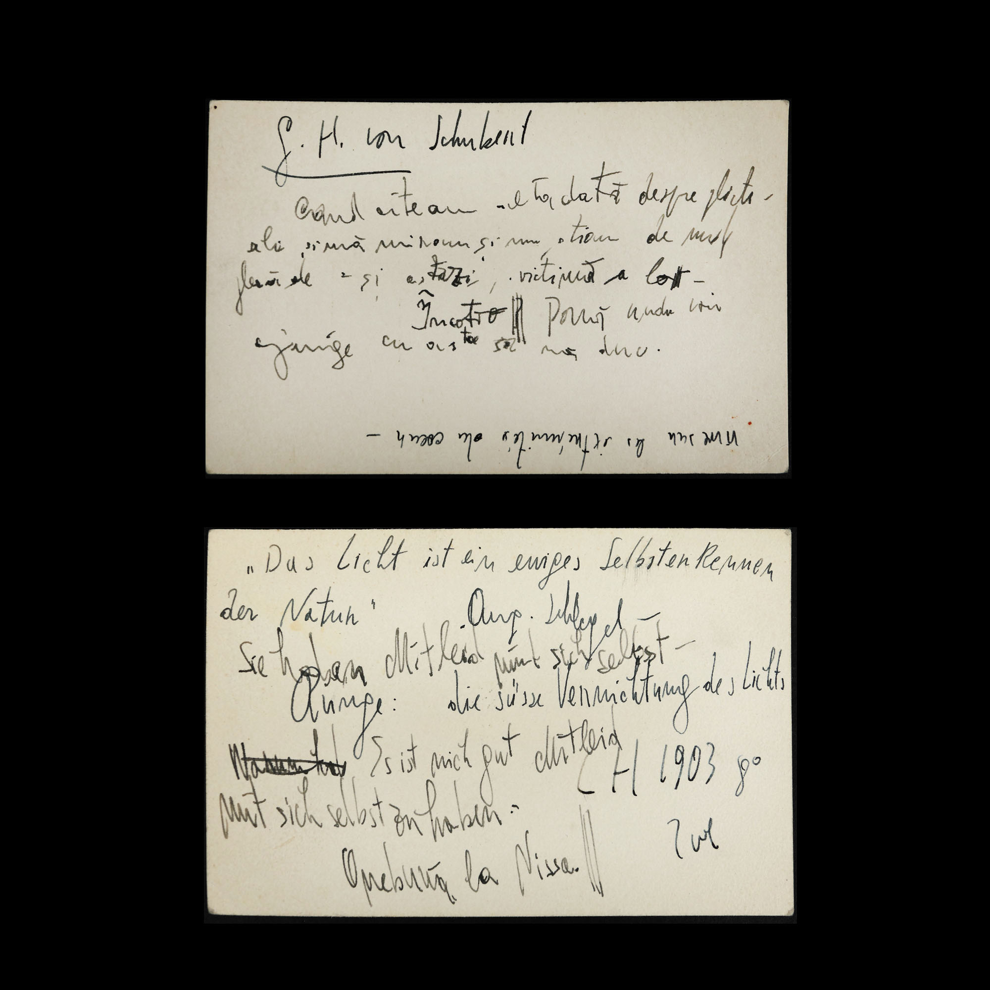 "Das Licht is ein ewiges Selbsterkennen der Natur" ["Lumina este o eternă autorecunoaștere a naturii”] Aug. Schlegel. Sie haben Mitleid mit sich selbst. [Se autocompătimesc/ le e milă de ele/ei însele/înșiși]. [Carl] Runge: die süsse Vernichtung des Lichts. [blânda distrugere a luminii] Es ist nicht gut[,] Mitleid mir sich selbst zu haben. [Nu e bine să te autocompătimești/să-ți fie milă de tine însuți]. CH 1903 8° 2. vol. [cotă de bibliotecă] O nebună la Nissa. G. H. von Schubert - Când citeam altădată despre plictiseli și mă miram și nu știam de unde pleacă ele – și astăzi victimă a lor – Încotro să mă duc? Până unde voi ajunge cu asta [?]. vivre sur les extrémités du cœur Comparând cu manuscrisele cioraniene de acest tip se poate spune cu certitudine că sunt databile între anii 18-23 ai lui (imediat după 1928), adică, cel mai probabil, în perioada studenției. Sunt citate de lectură, gânduri aruncate unde se nimerea. Scrisul acesta febril și grabito-neglijent este specific acelei perioade.