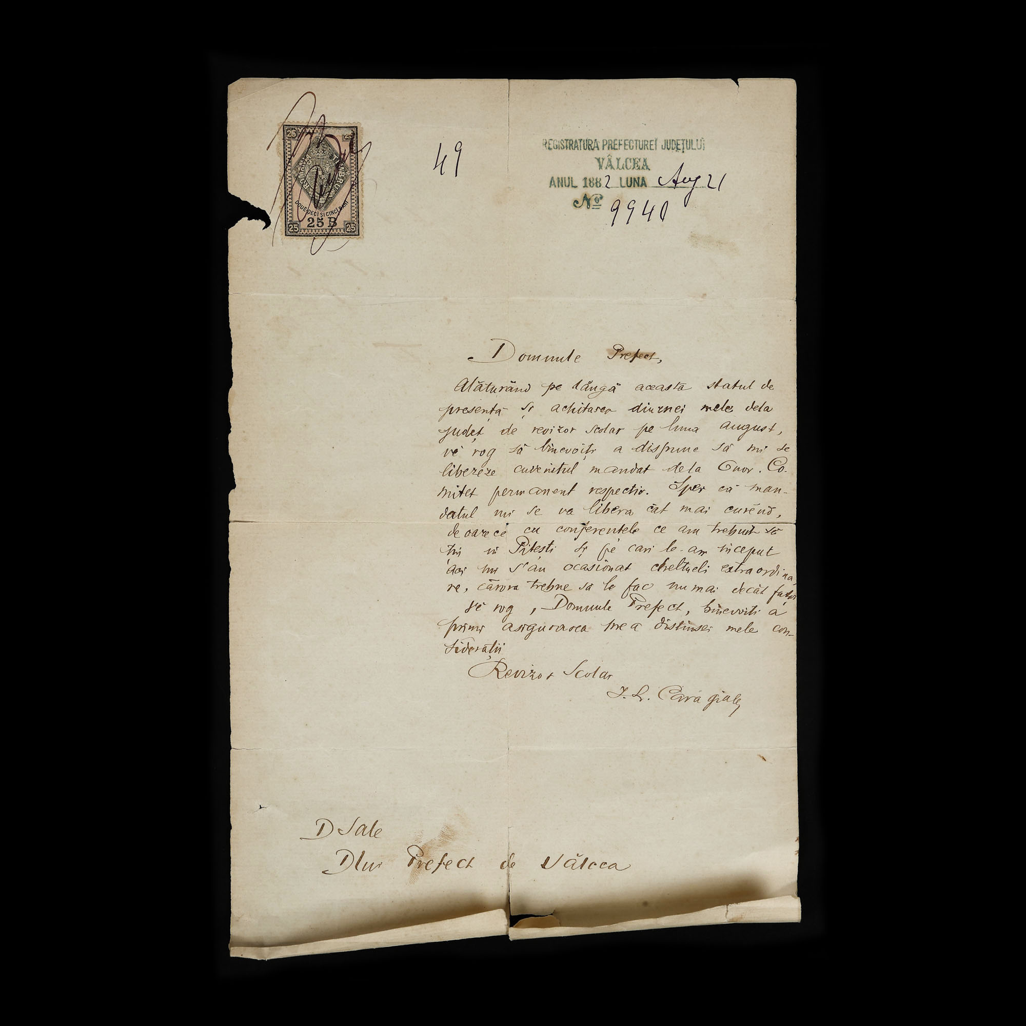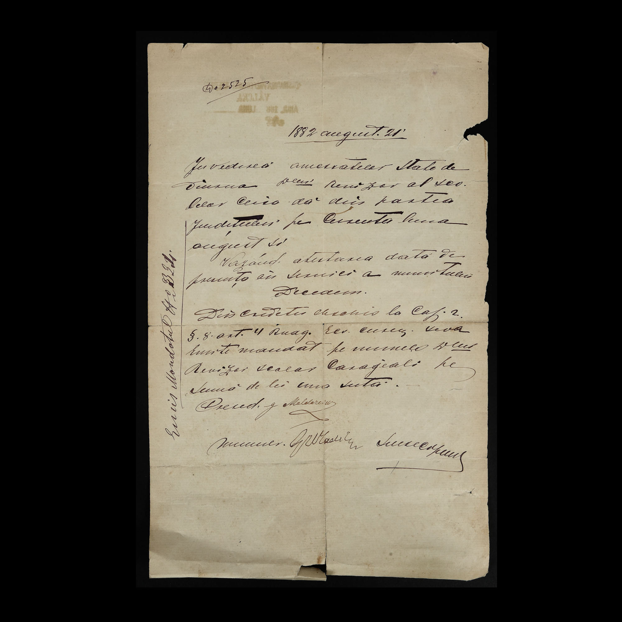 90. Cerere referitoare la plata diurnei cuvenite pentru luna august, scrisă de Ion Luca Caragiale, 21 august 1882, cu semnătura olografă a dramaturgului, piesă rară, de colecție