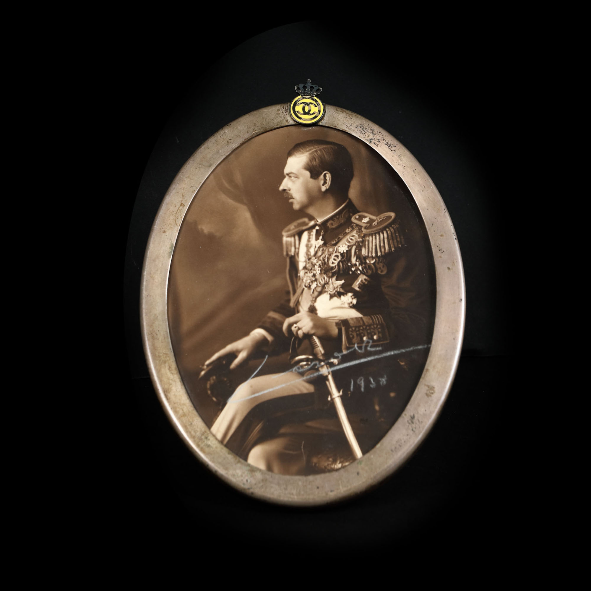 56. Fotografie ilustrându-l pe Regele Carol al II-lea, ramă din argint decorată cu efigia regelui și coroana regală, 1938, cu semnătura olografă