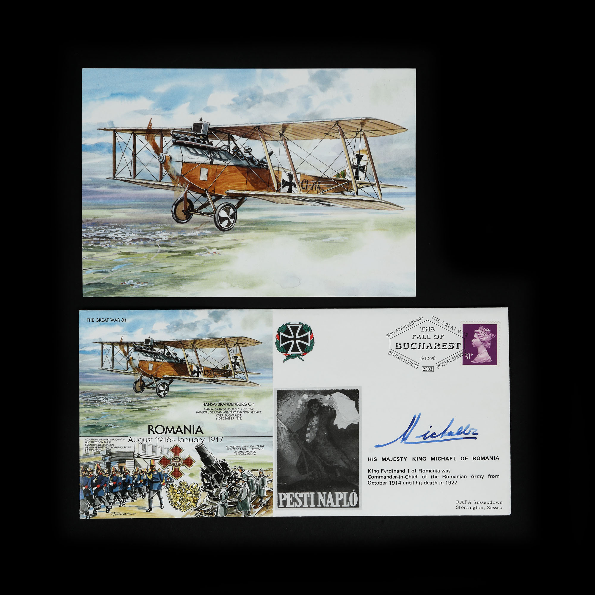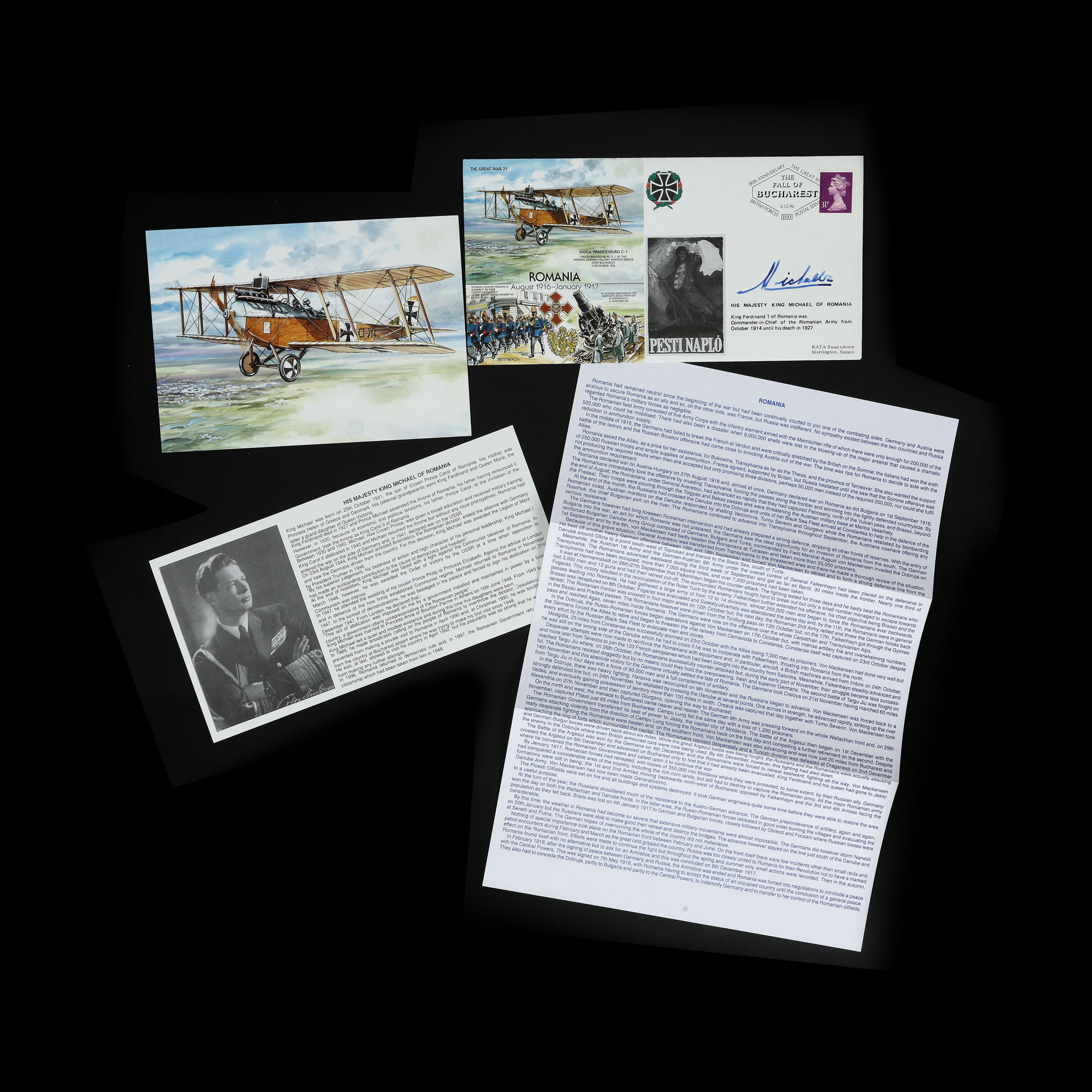 58. Lot aniversar ”80 de ani de la căderea Bucureștiului”, format din carte poștală, plic și scurt istoric al evenimentului, engleză, Sussex, Anglia, 1996, cu semnătura Regelui Mihai și certificat de autenticitate