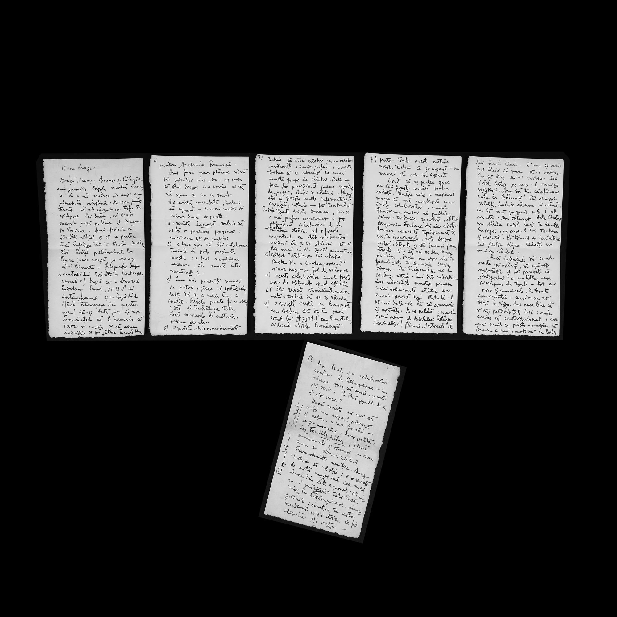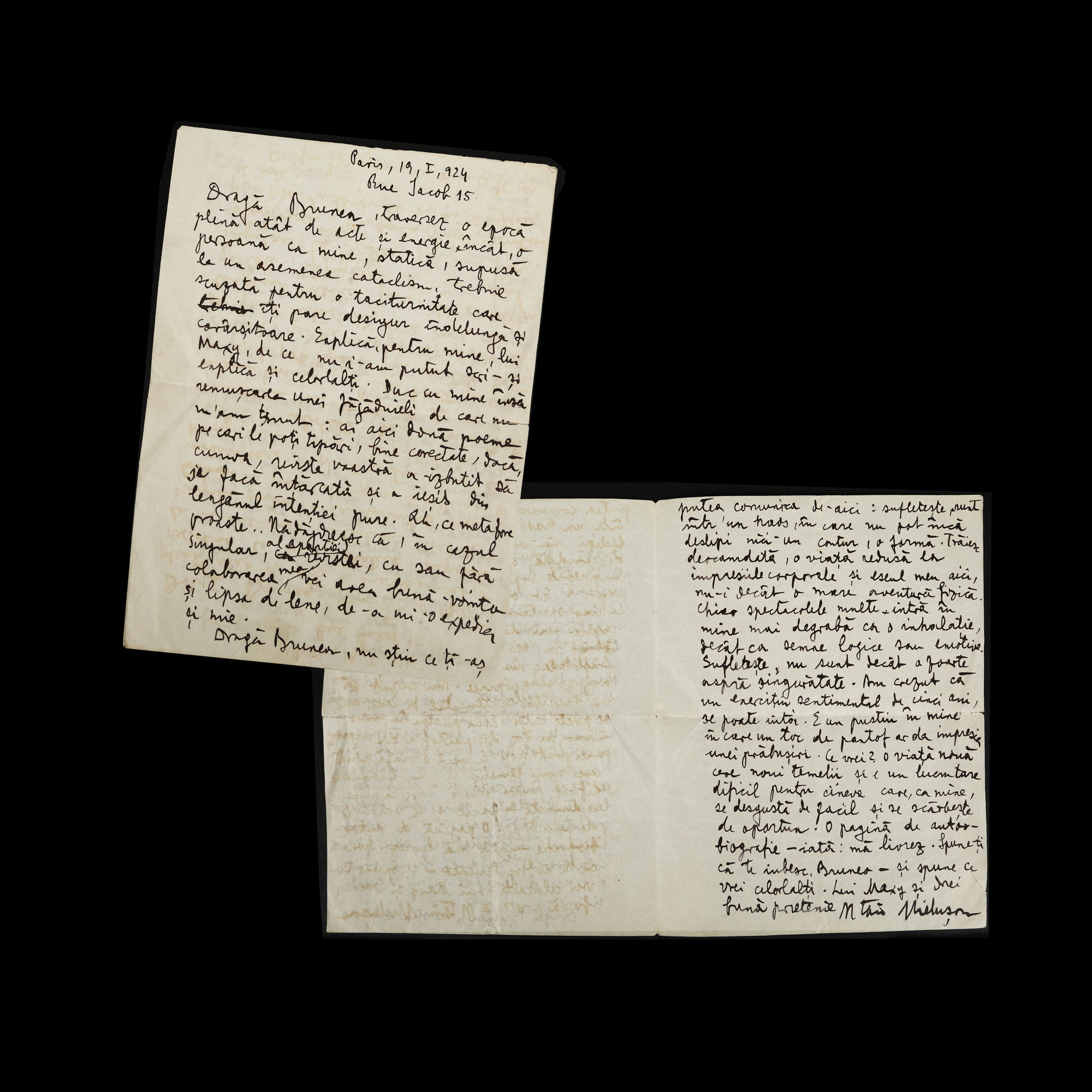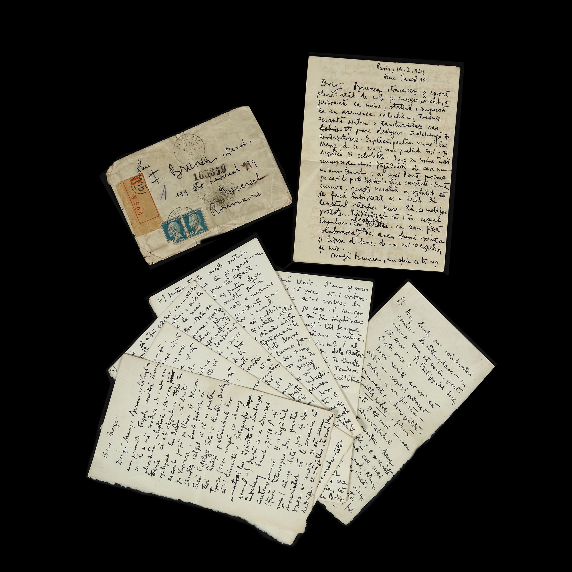 98. Lot format din două scrisori trimise de Benjamin Fundoianu către Filip Brunea-Fox, referitoare la momentul nașterii revistei de avangardă ”Integral”, Paris, 19 ianuarie 1924, cu plic și semnătura olografă (două file și șase file)