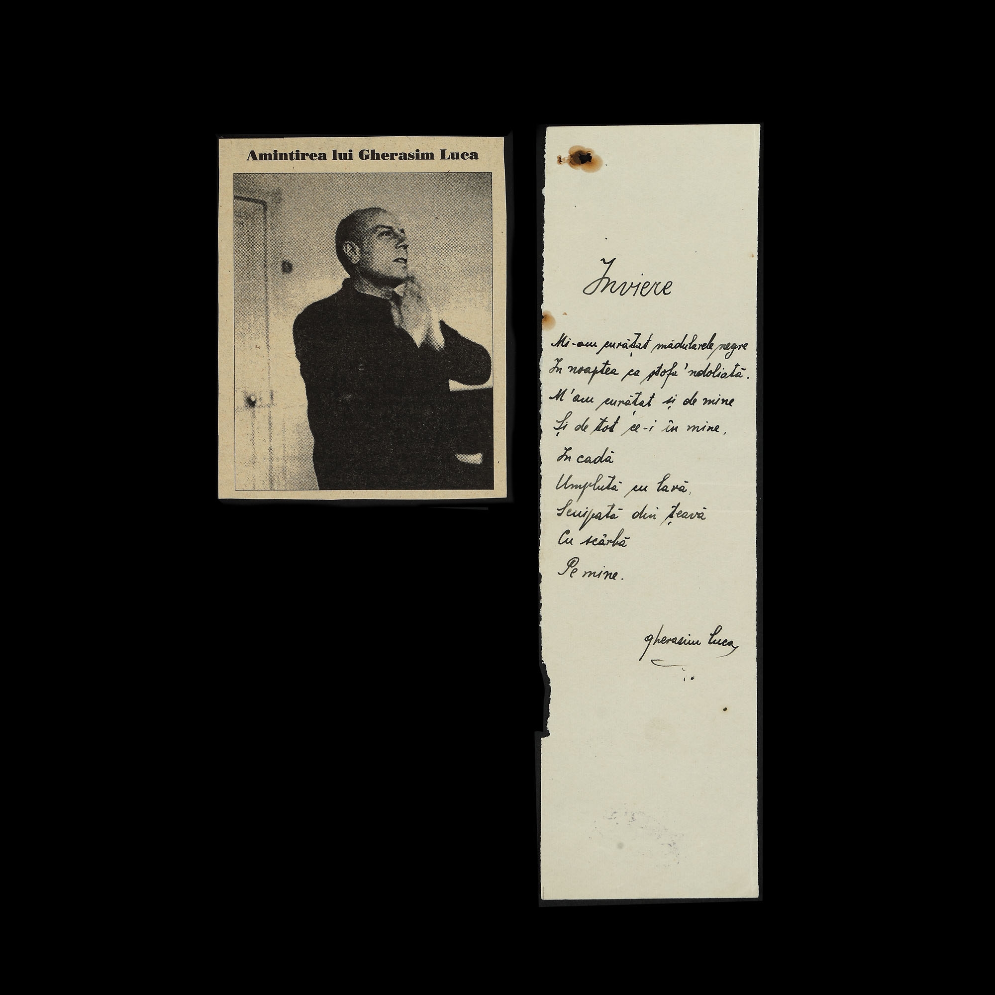 74. Lot format din manuscrisul ”Înviere”, de Gherasim Luca, și o reproducere fotografică a poetului, cu ex-libris și semnătura olografă, provine din colecția poetului avangardist Sașa Pană