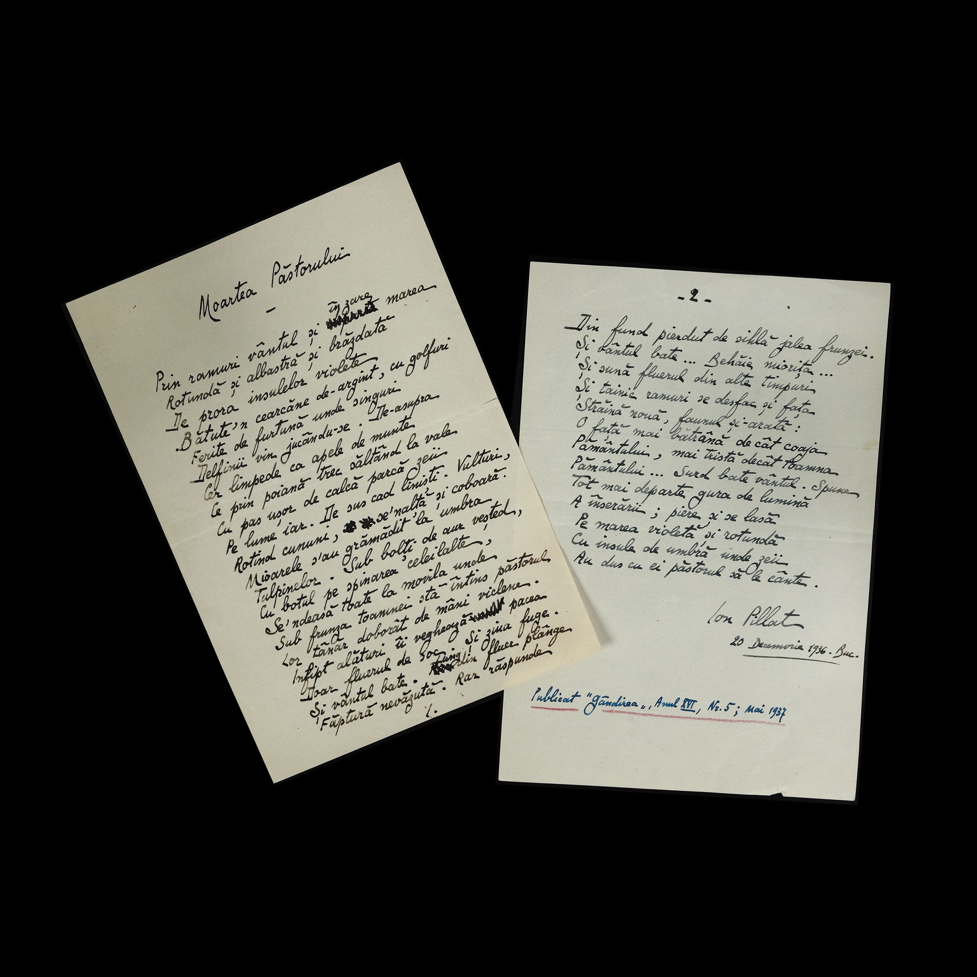 73. Manuscrisul poeziei ”Moartea Păstorului”, de Ion Pillat, București, 20 decembrie 1936, cu semnătura olografă (două file)