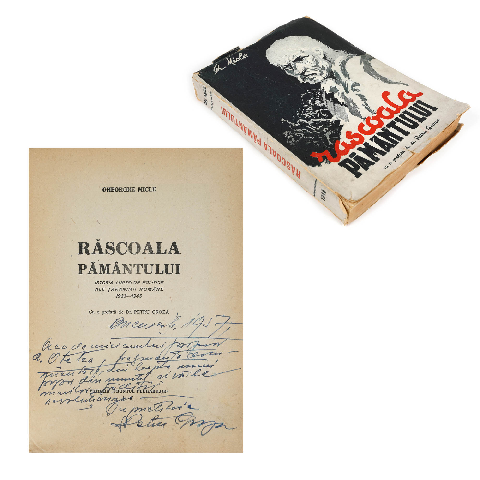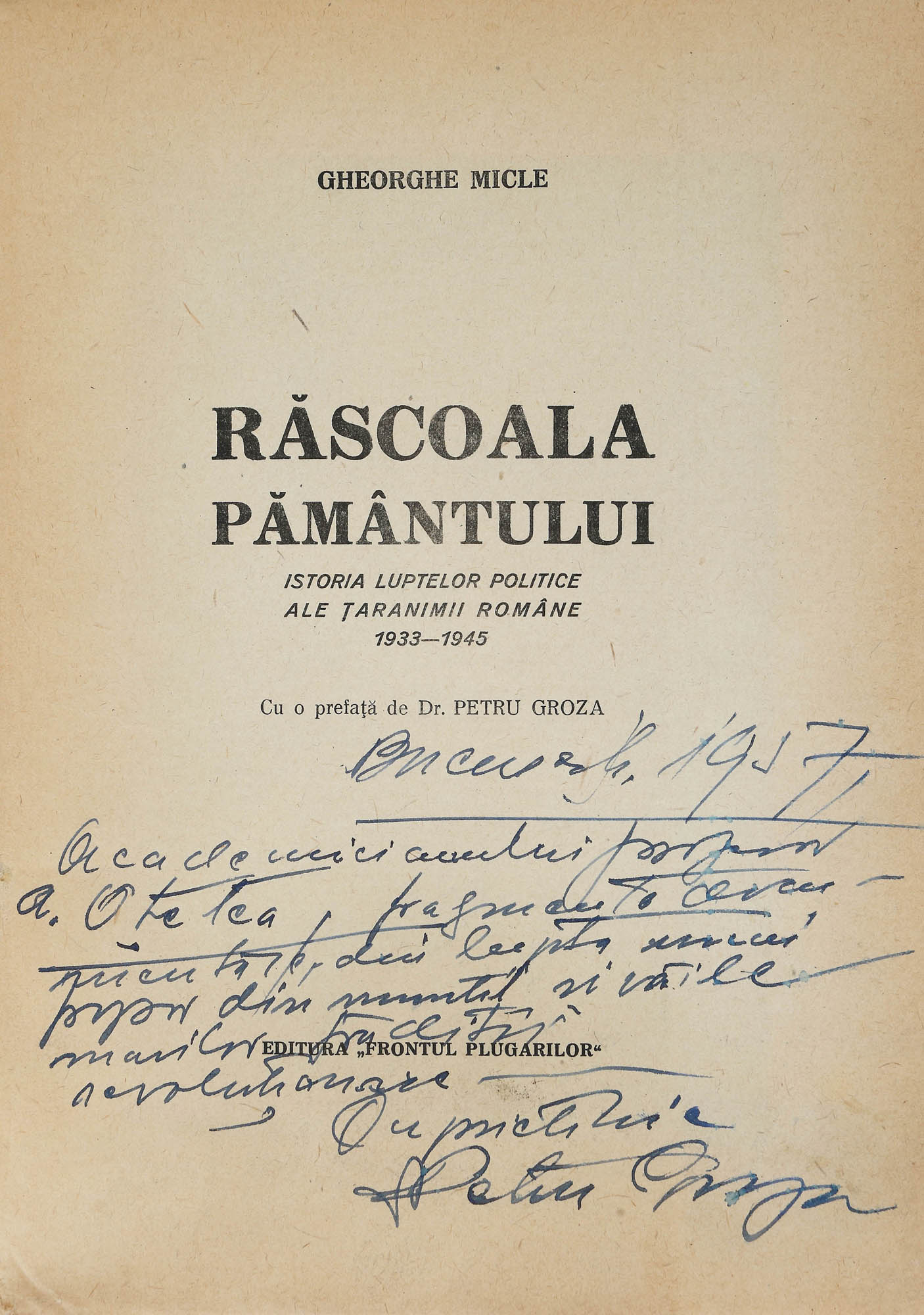 50. ”Răscoala pământului”, de Gheorghe Micle, București, 1945, cu dedicația și semnătura olografă a lui Petru Groza