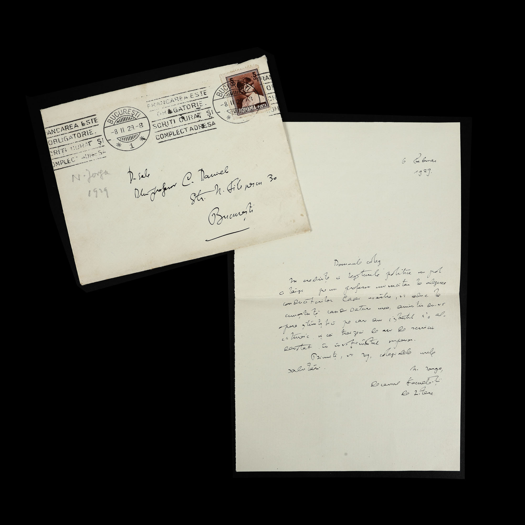 104. Scrisoare trimisă de Nicolae Iorga către istoricul și orientalistul Constantin Daniel, București, 8 noiembrie 1929, cu plicul original și semnătura olografă