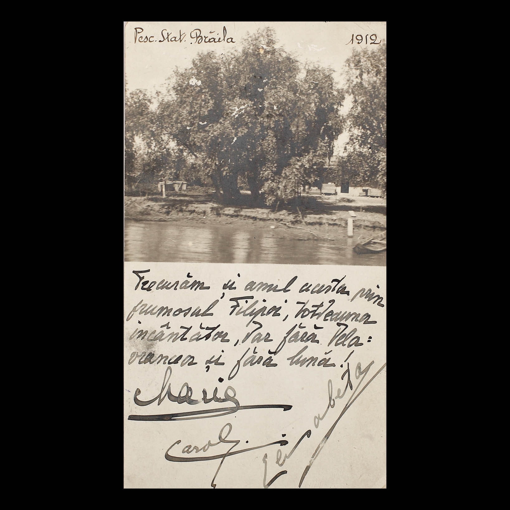 53. Vedere din Delta Dunării adresată lui Barbu Delavrancea în 1912 de către viitoarea Regină Maria și de către doi dintre copiii săi, viitorul Rege Carol II și principesa Elisabeta, purtând semnăturile olografe ale expeditorilor, provine din colecția scriitorului Corneliu Vadim Tudor