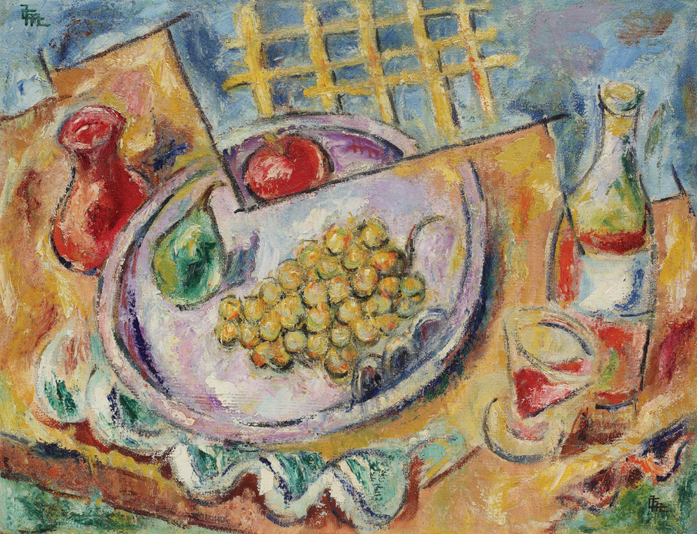 Traseul inedit pe care l-a urmat Corneliu Michăilescu ne prezintă unul dintre cei mai conștiincioși pictori ce s-au manifestat pe scena artistică românească în perioada interbelică. Mânat de alte idealuri decât a colegilor de breazlă, imediat după finalizarea cursurilor la Școala de Belle Arte din București(1912), Michăilescu nu va lua drumul marilor capitale artistice(Munchen, Paris), ci, atras de maeștri renascentiști, va pleca la Florența. Această primă perioadă de creație, o etapă eclectică, în care artistul experimentează cu pictura în aer liber, cu expresionismul, dar mai ales cu fovismul va fi definită de cele două stagii de pregătire în Italia, finalizate în 1921, când se întoarce în țară. Încă de la prima manifestare expozițională din țară, în aprilie 1922, Michăilescu se va detașa de tipologiile bine cunoscute ale mișcărilor academice, anunțând manifestările cubiste de mai târziu ale lui Marcel Iancu sau M.H.Maxy. Limbajul sintetic pe care îl aborda pictorul încă din 1922 va fi cel care îi va caracteriza estetica pâna la momentul accesării unor subtraturi suprarealiste, relevante anilor ’30. Particularitatea cubismului accesat de Michăilescu s-a conturat în capacitatea acestuia de a refuza o curerire completă a deconstrucției, pe care, chiar dacă a folosit-o, a supus-o unei rigori figurative “tradiționale”. Admirator al desenului clasic, pictorul va echilibra mereu tendința de integralizare a cubismului, evitând acea dizolvare formală. În toate genurile abordate de-a lungul deceniului trei, Michăilescu s-a arătat interesat în special de analizarea și descompunerea lucrului văzut doar la nivelul afectiv al valori intime, păstrând totuși forma inițială. Căutând să explice esența obiectului, uleiurile sale s-au concentrat să păstreze în registrul imediat formal caracteristica naturală, fapt relevat în special prin concesiile cromatice. Față de tiparele cubiste, Michăilescu nu trece culoarea pe un plan inferior și nici nu se limitează la culori neutre. Reminiscențele foviste din primele etape italienești se vor face simțite mai ales în tratarea naturilor statice, unde interogațiile în privința formei sunt supuse unui mediu controlat(atelierul), susceptibil experimentului cromatic. Optica cubistă avea să se accentueze către sfârșitul anilor ’20, cu preponderență în cazul naturilor statice. Chiar dacă abstractizarea nu anunța încă perioada suprarealistă, ea este împinsă la limită în special prin dizolvarea centrului compozițional și al punctelor de perspectivă, tehnică echilibrată prin păstrarea proporțiilor naturale ale obiectelor analizate. Acordul dintre forma și efectul senzorial devenea un principiu de conduită în estetica lui Michăilescu, experimentând cu acordurile cromatice, alăturând tonurile opuse, cald-rece, într-o pictură împăstată, viguroasă. În cazul naturii statice de față, principiile menționate mai sus par să fie cele ce orânuiesc componentele plastice ale operei. Într-o abordare dezinhibată a unei teme clasice, Michăilescu accentuează efectul constructivist-cubist, prin abordarea conturului acuzat, tipic unor construcții cubiste. Jocul liniilor de marcație, care aici alternează de la diagonala statică la cea curbă, caută să imprime un ritm pronunțat, prin care aparentul spațiu aflat într-un instantaneu de echilibru să fie predispus unui potențial dinamic. Paleta de culori este cea care impresionează dincolo de construcția eficientă a cadrului formal, fiind abordată într-o manieră cezanniană. Alternanța senzorială a tonurilor opuse, folosirea violetului și a oranjului, drept culori primordiale, dar mai ales incertitudinea spațială fac din “Natura statică cu fructe” una dintre cele mai evidente realizări “moderniste” ale lui Michăilescu, relevantă discursului plastic atât de personal. (I.P.)