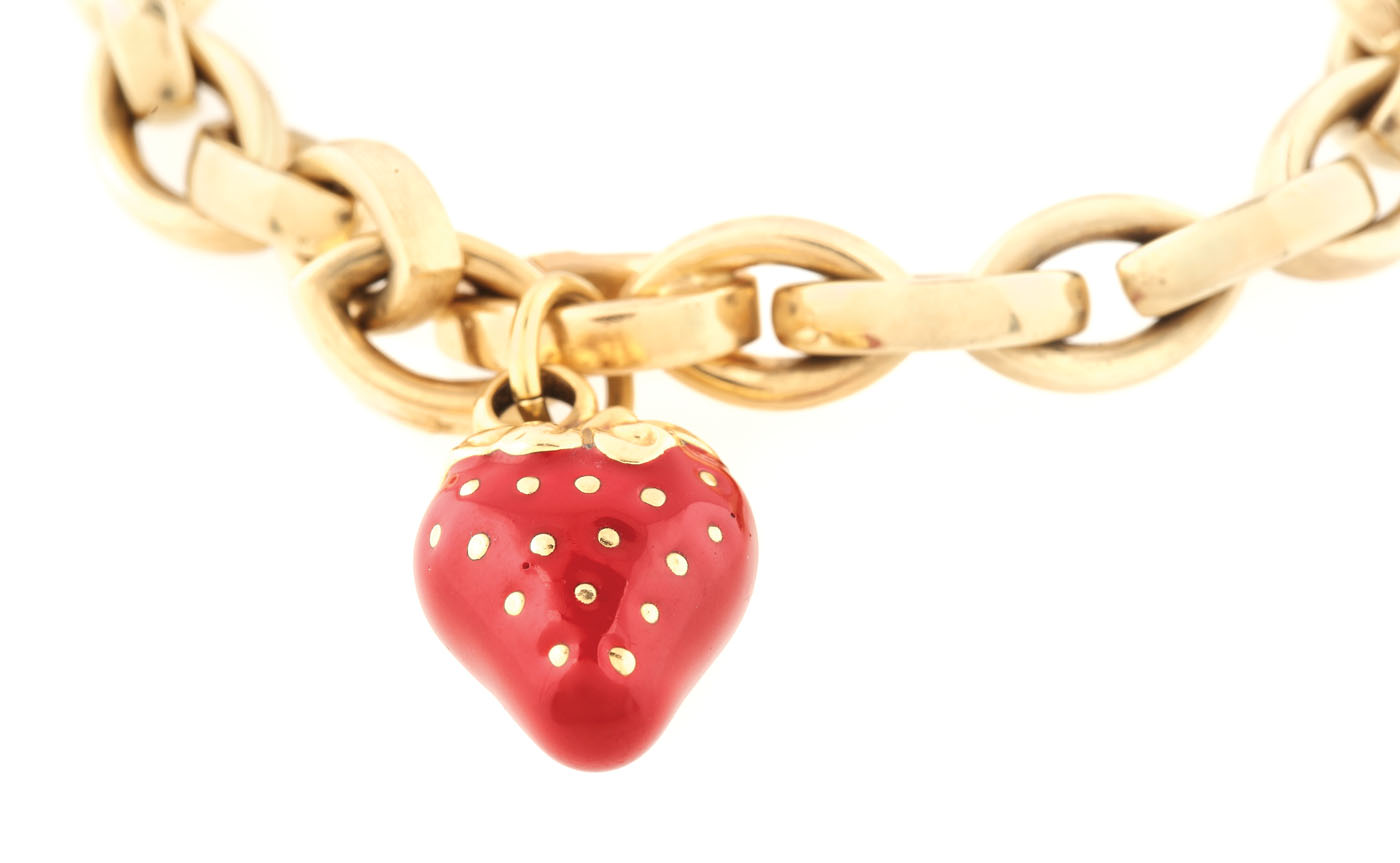 52. Brățară din aur, decorată cu pandantiv-căpșună ornat cu email