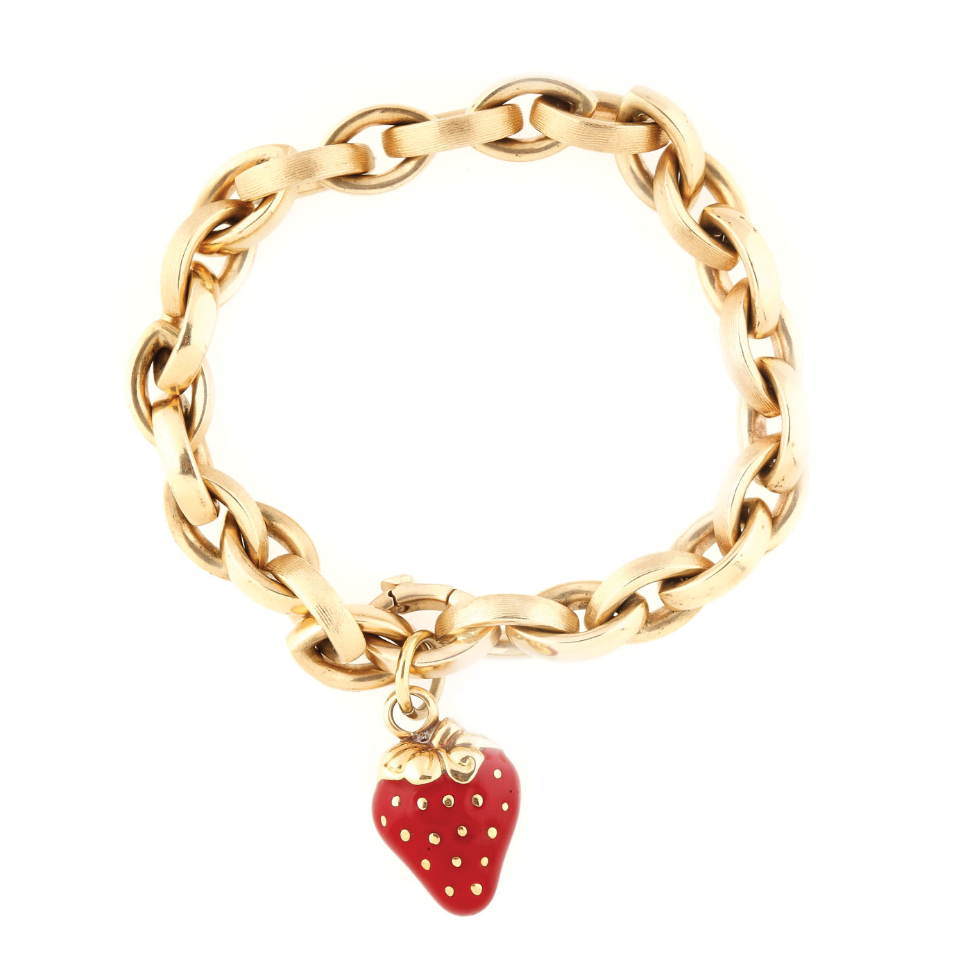 brățara: aur galben 14 k; anoul și căpșuna: aur galben 18 k; email