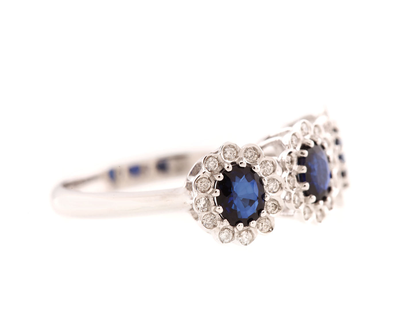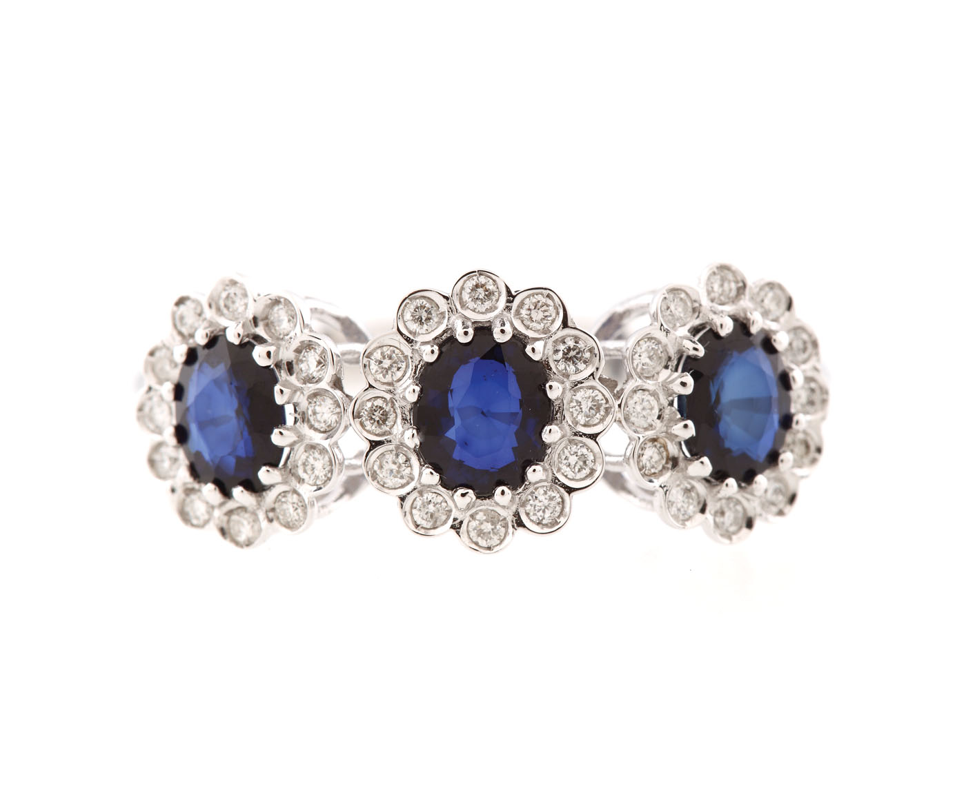 3 blue oval faceted sapphires, eye-clean, ca. 1.31 ct. and 36 round brilliant-cut diamonds, H-I colour, SI-I1 clarity, ca. 0.22 ct.