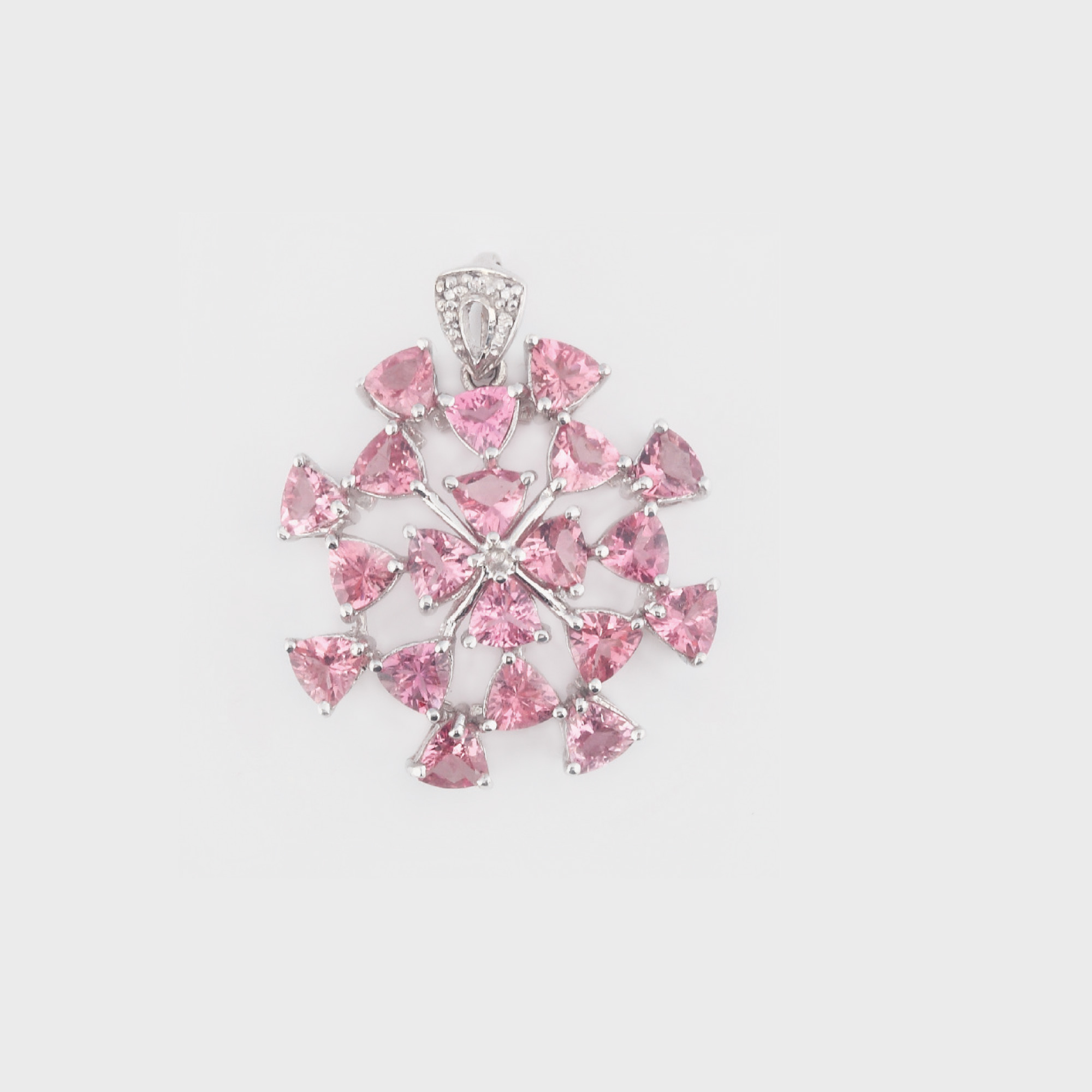 20 rhodolite şlefuite triunghi cca. 4,6 ct. total şi 3 diamante cca. 0,015 ct. total, claritate VS, aur alb 9 k, 3,9 g