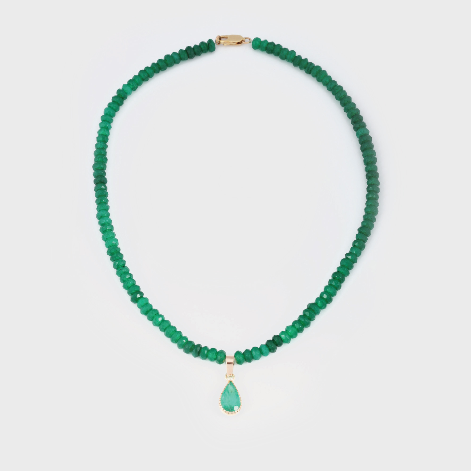 aur galben 14 k, 116 smaralde cu tăietură fancy cca. 40 ct total, un smarald cu tăietură pară cca. 3,5 ct total și un diamant cu tăietură briliant 0,08 ct total, smarald culoare verde mediu închis, claritate Gem; diamant culoare fancy yellow, claritate I1