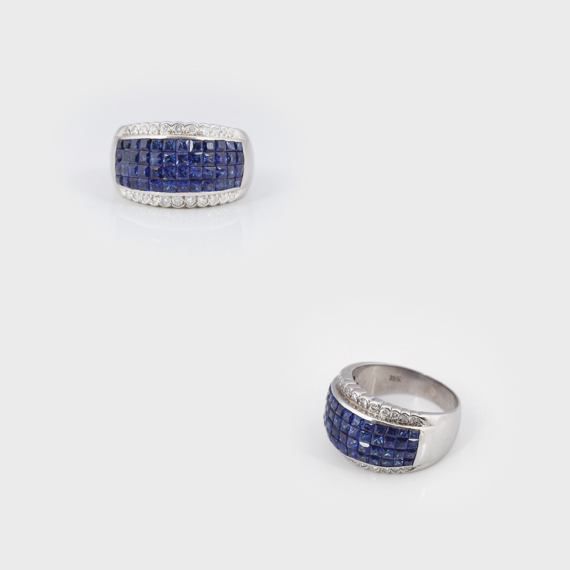 aur alb 18 k, 48 safire cu tăietură princess cca. 2 ct total și 22 diamante cu tăietură briliant cca. 0,22 ct total, diamante culoare H, claritate SI1; safire culoare albastru mediu închis, claritate VS