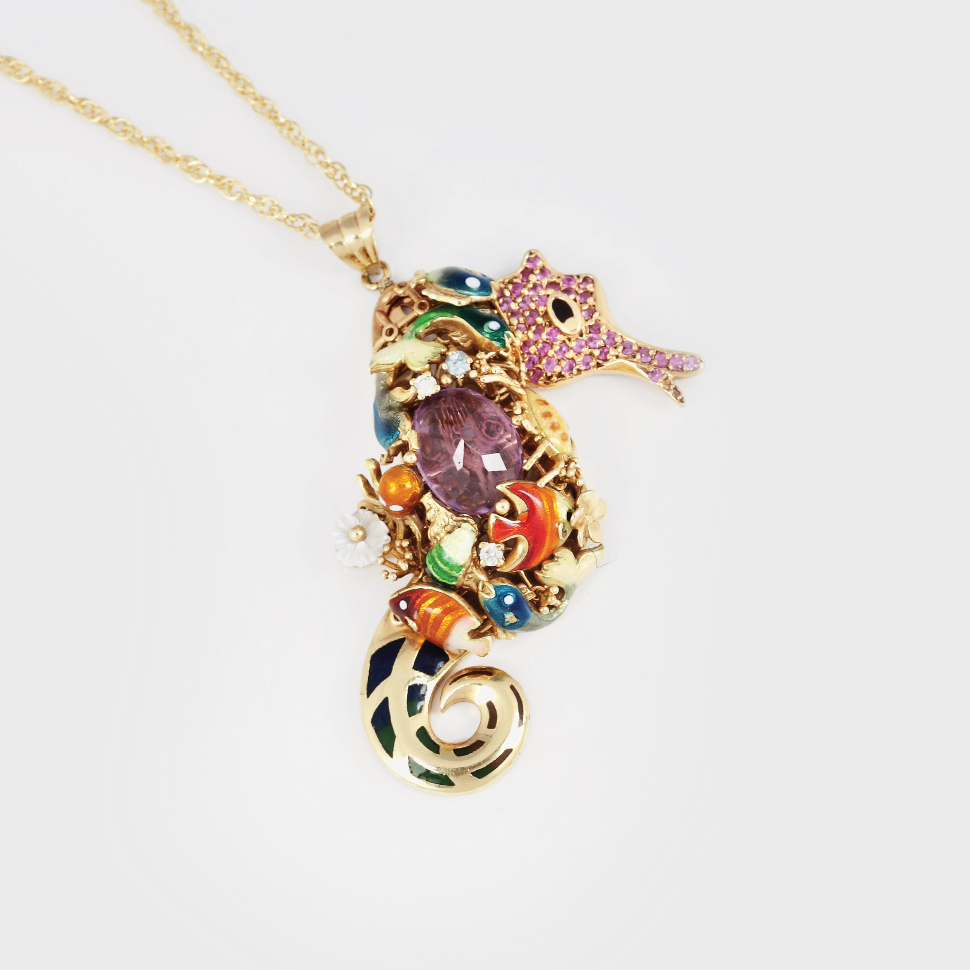 221. "Căluț de mare" - pandantiv din aur, decorat cu mix de diamante, rubine, ametist și topaz [Sec. XX]