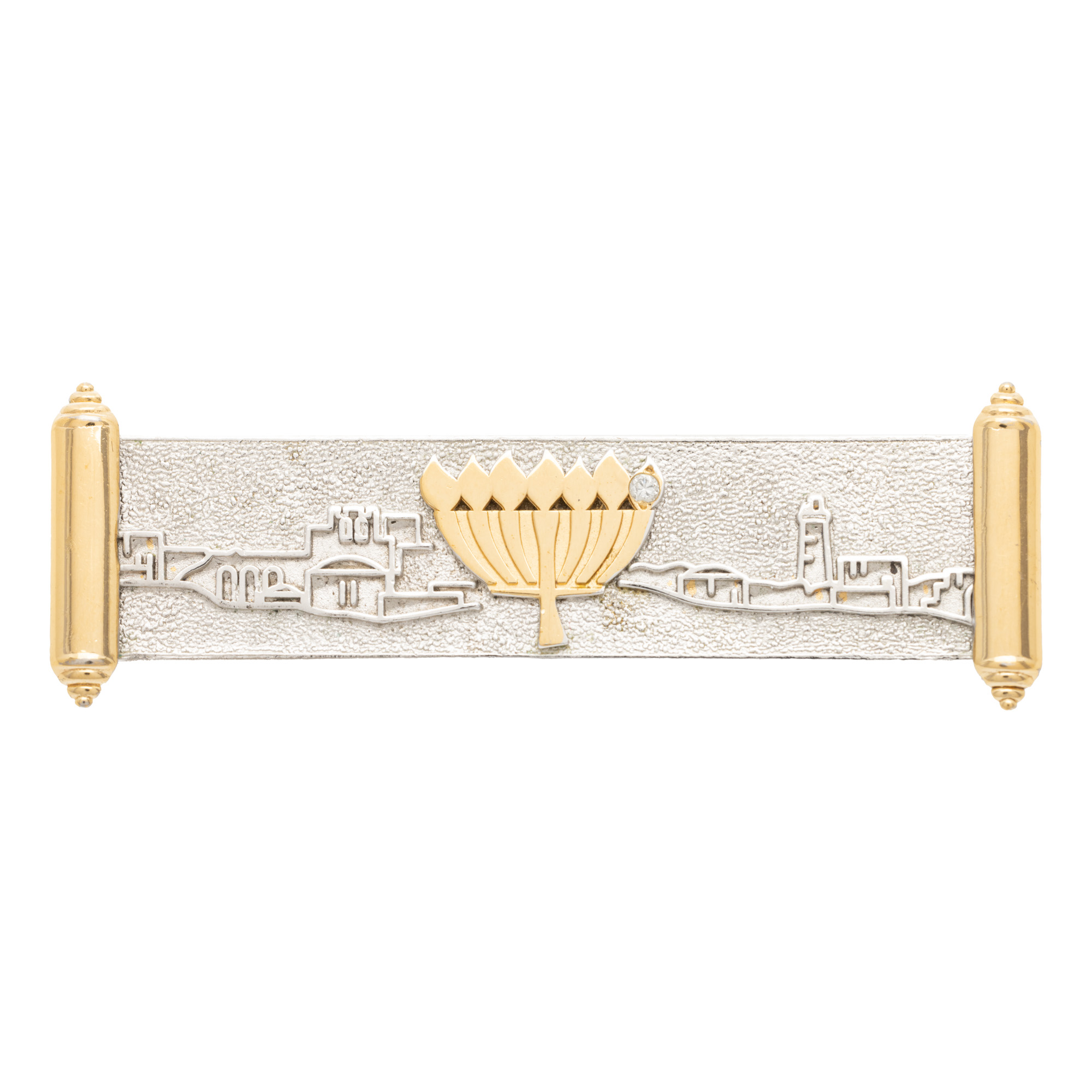 42. Broșă din argint aurit, realizată în forma unei Torah, ornată cu un diamant