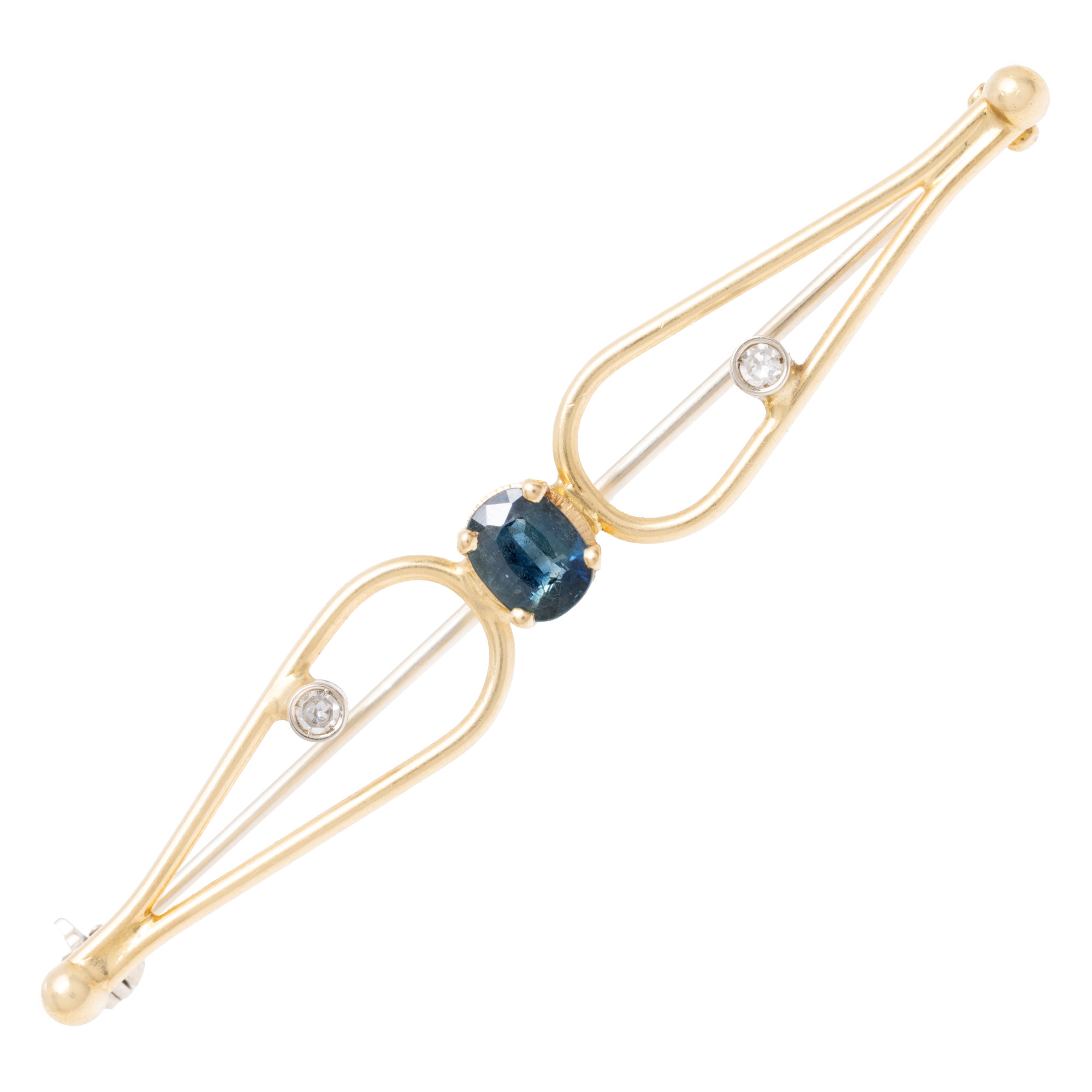 1 safir oval fațetat, culoare albastru, claritate eye-clean, cca. 0,55 ct. și 2 diamante single cut, culoare I-J, claritate SI2-I1, cca. 0,04 ct.
