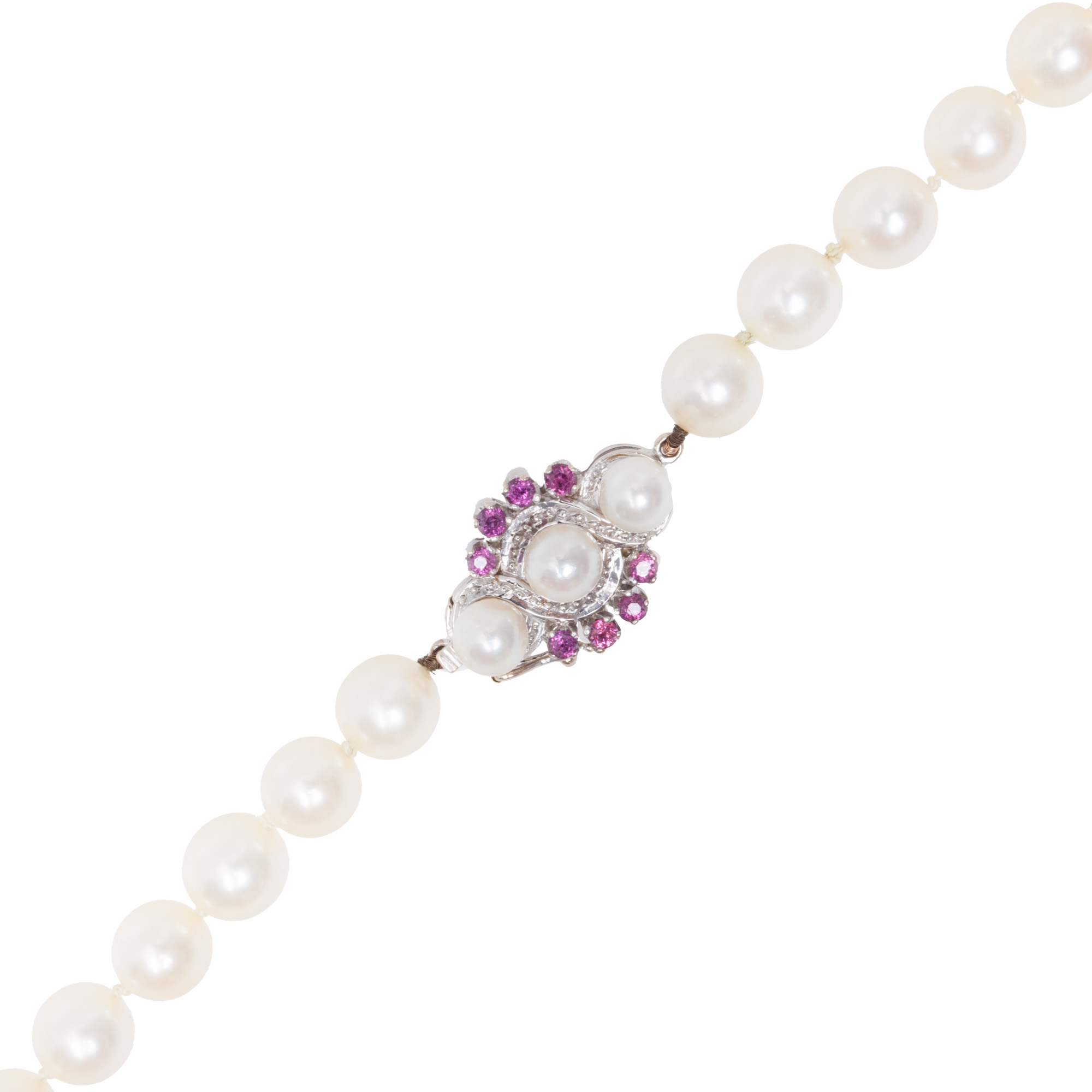 14. Colier din perle Akoya, cu închizătoare din aur alb decorată cu rubine, însoțit de certificat gemologic suplimentar