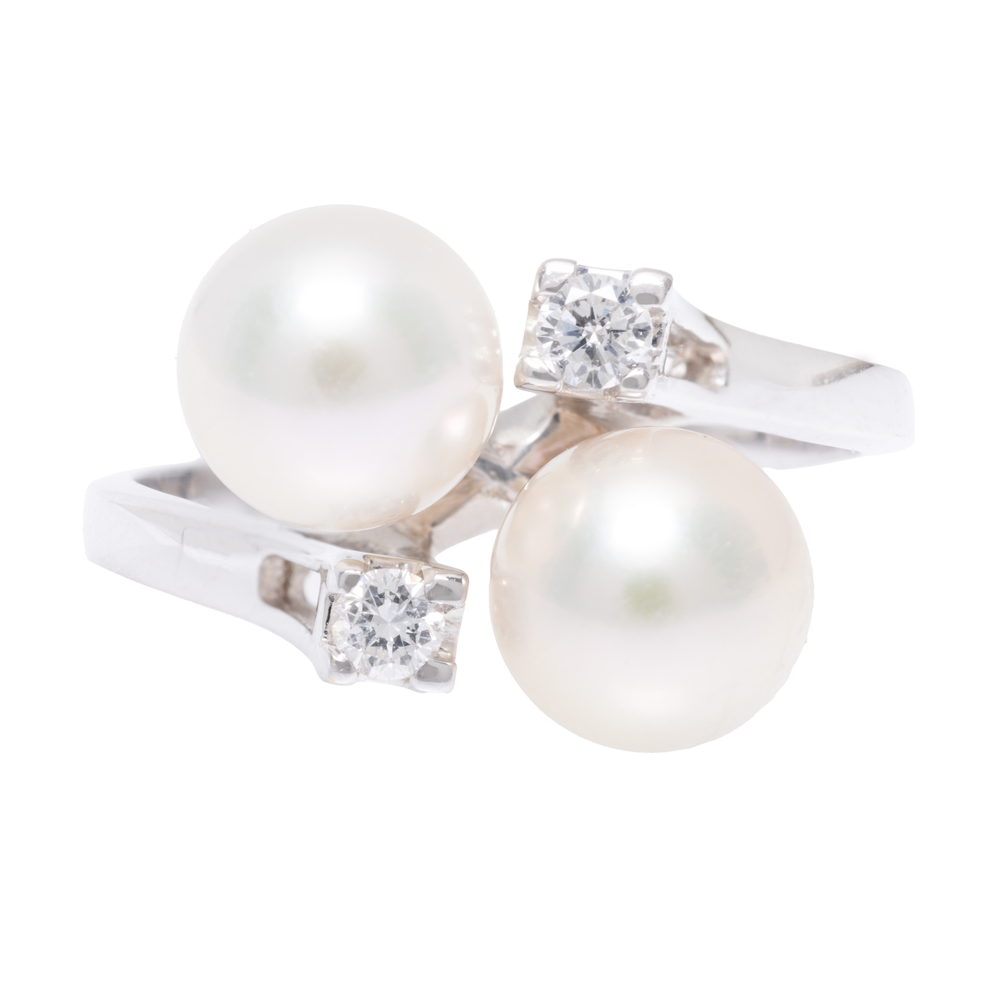 2 diamante rotunde briliant, culoare H-I, claritate VS1-VS2, cca. 0,14 ct. și 2 perle de cultură Akoya, rotunde, albe, d=7,49-7,52 mm