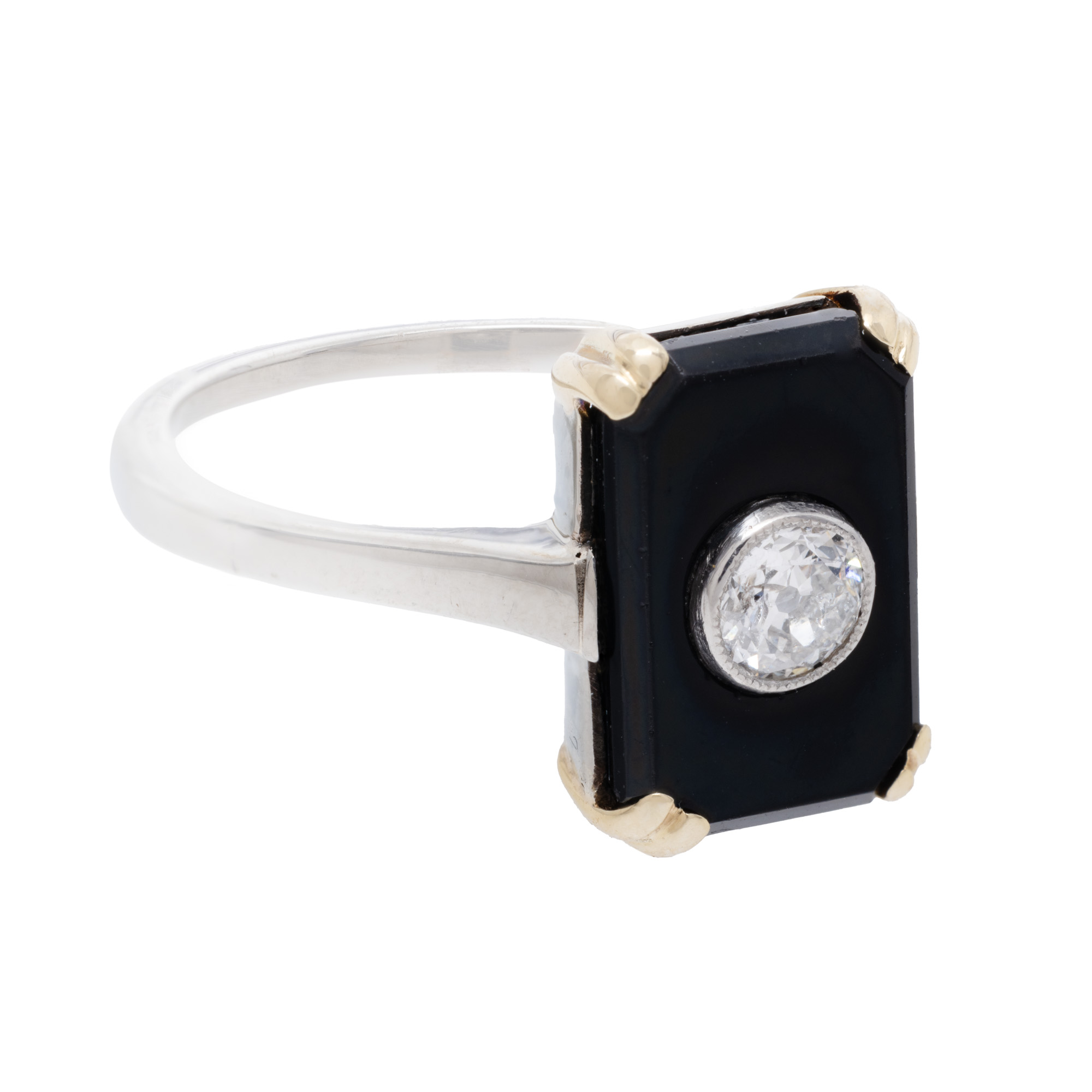 34. Inel din aur bicolor, decorat onix și un diamant briliant, însoțit de certificat gemologic suplimentar