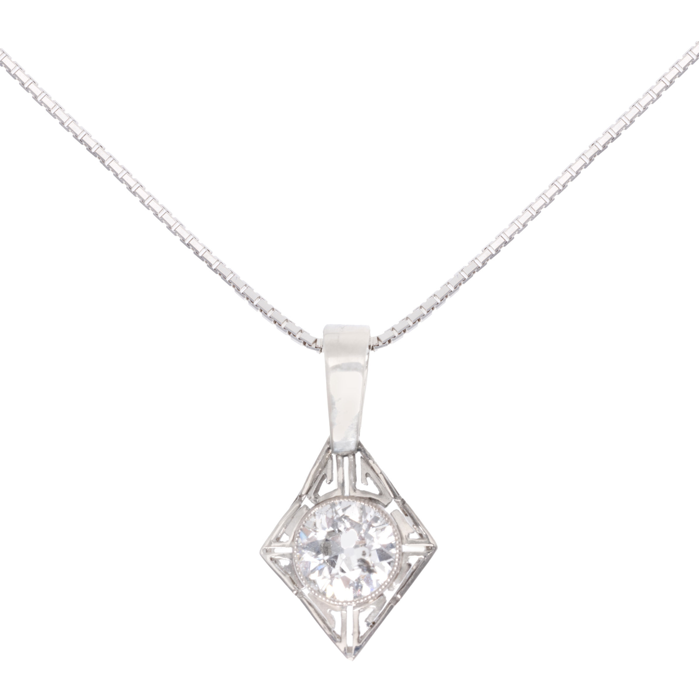 106. Lanț cu pandantiv Art Deco, din aur alb, decorat cu un diamant, însoțit de certificat gemologic suplimentar