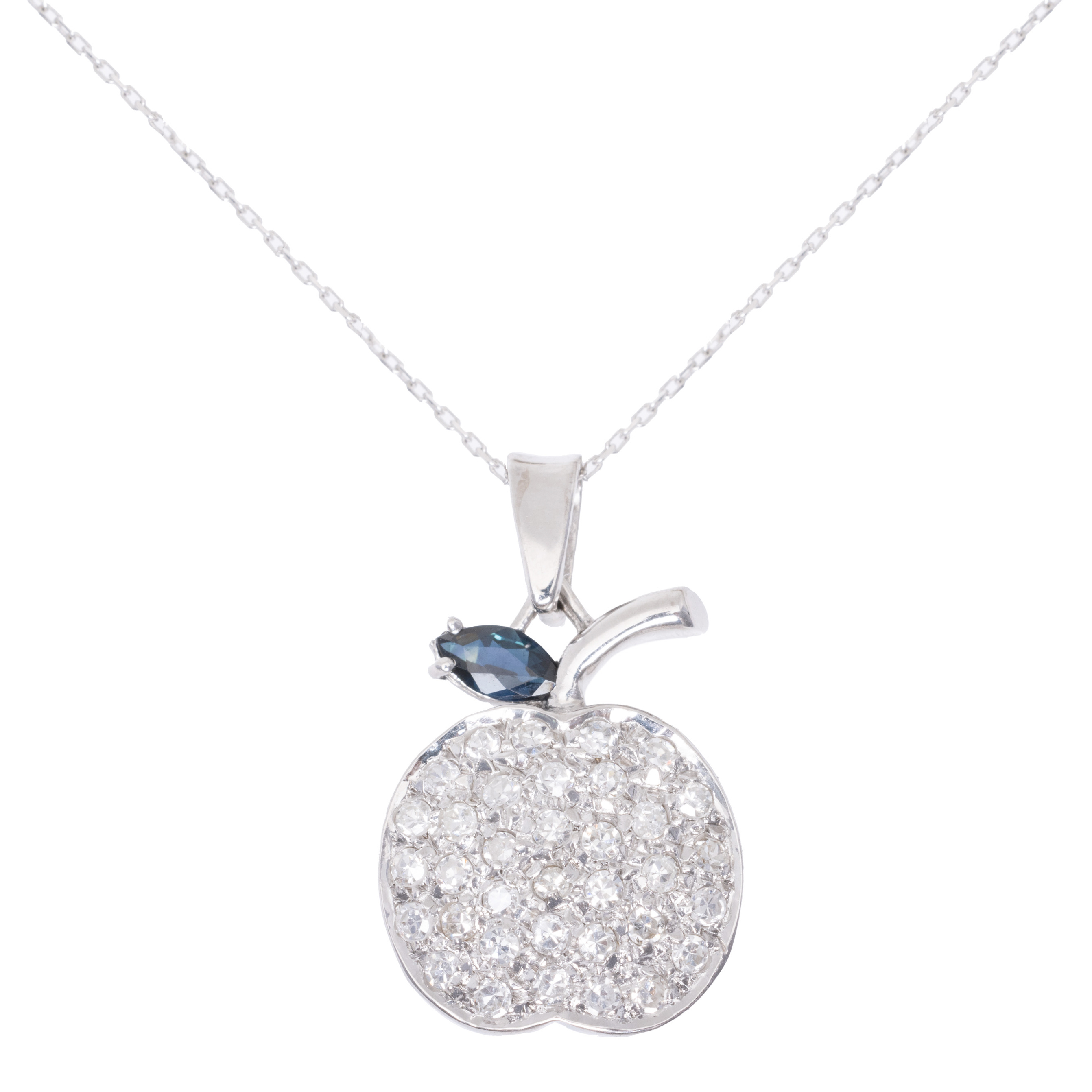 39. Lanț cu pandantiv din aur alb, sub formă de măr, decorat cu safir și diamante, însoțit de certificat gemologic suplimentar