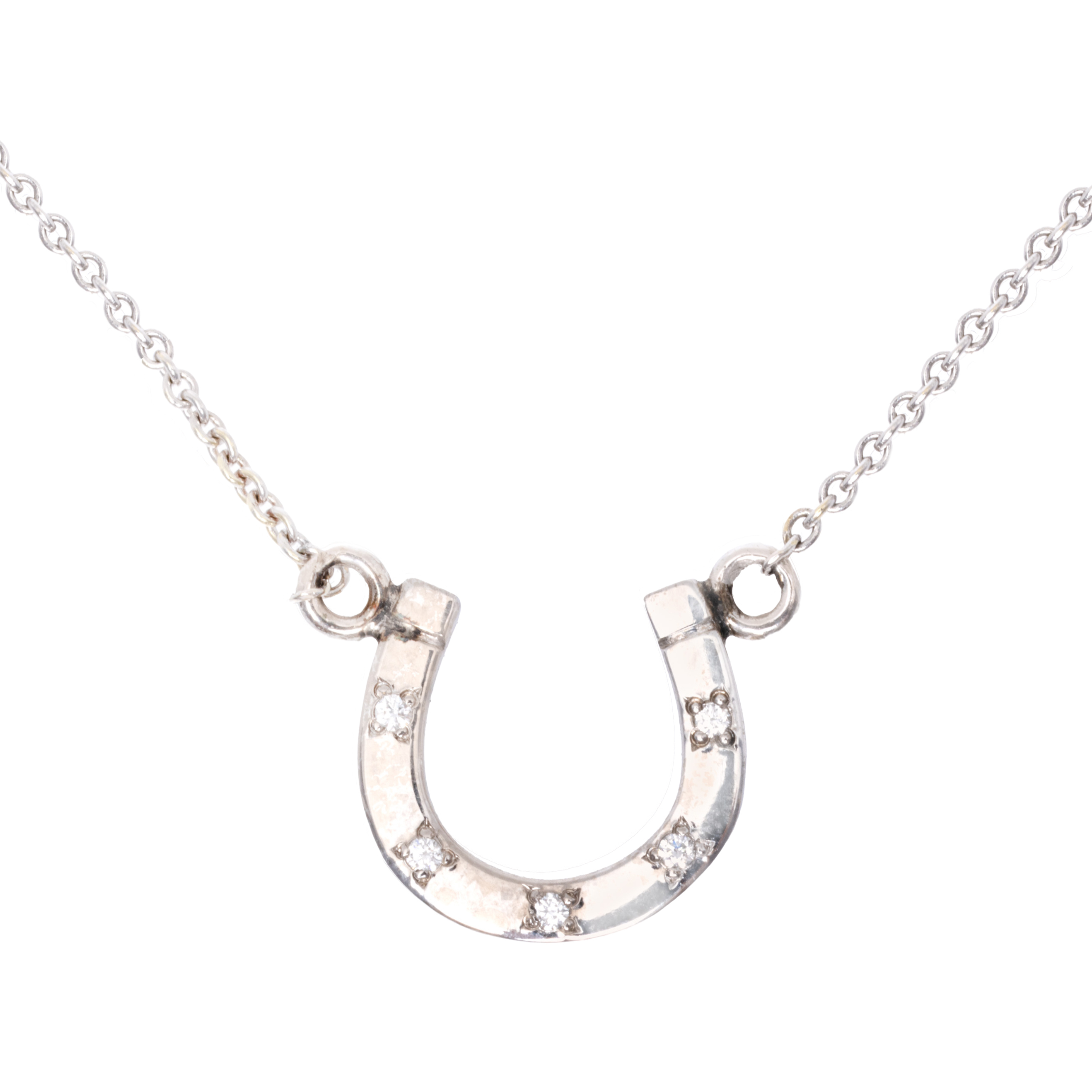 37. Lanț cu pandantiv din aur alb, sub formă de potcoavă, decorat cu diamante